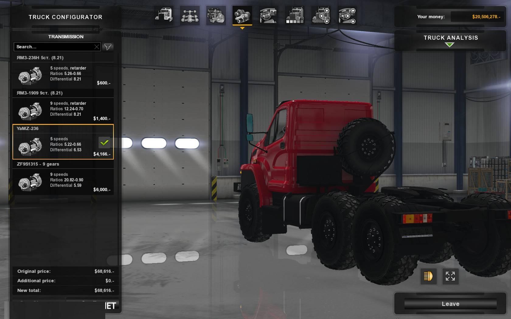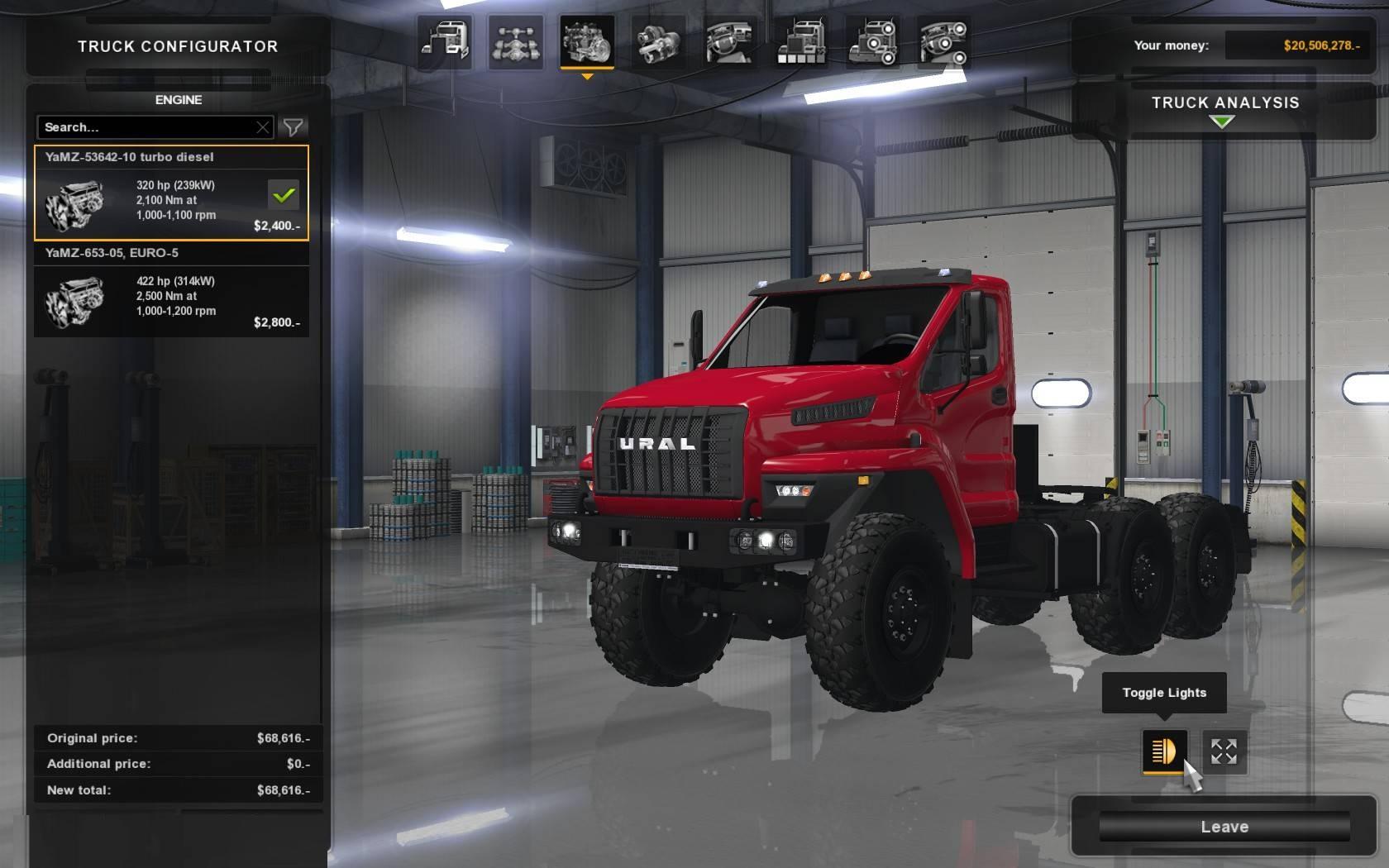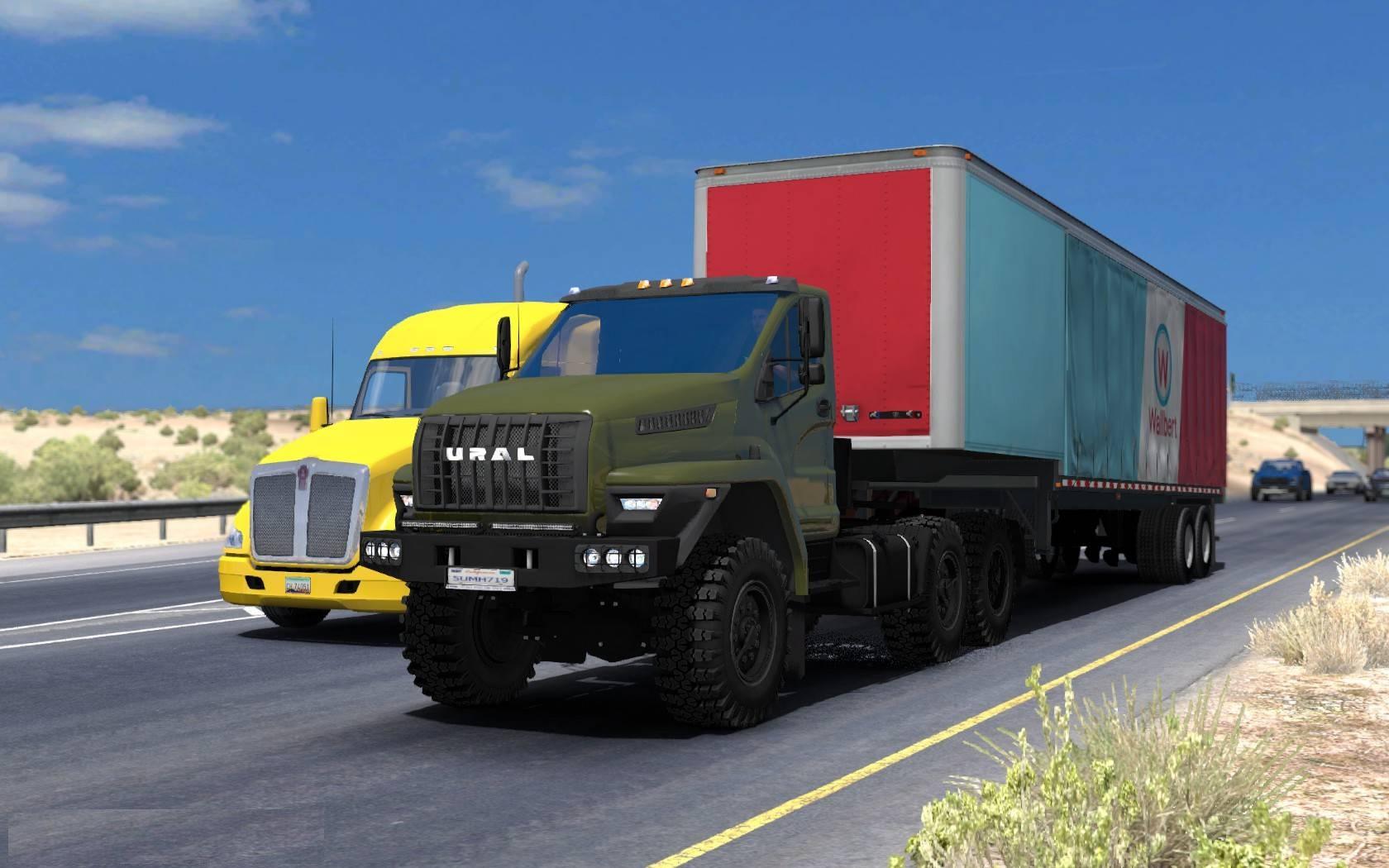 Ural Next mod for ATS 1.31.x: - Have somewhat accurate sound(YaMZ engine sound) - Have somewhat realistic engines (YaMZ 536,653, Max.speed ~60mph) - Have somewhat realistic transmissions (YaMZ, ZF 5,9 speeds) - Added additional Ural tire set for regular ATS trailers. - Buy in Volvo dealer(Tucson, Las Vegas for default maps and in other places in additional maps where Volvo dealer is presented). NOTE: Read mod description in mod manager! Credits: Russian_Dalnoboy(original mod), EKU |