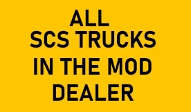 This mod makes all the SCS trucks available in the “Truck Mod Dealer”. The trucks are also fully unlocked This mod will also advance you to level 29 (if you are not already there) witch unlocks the trucks.