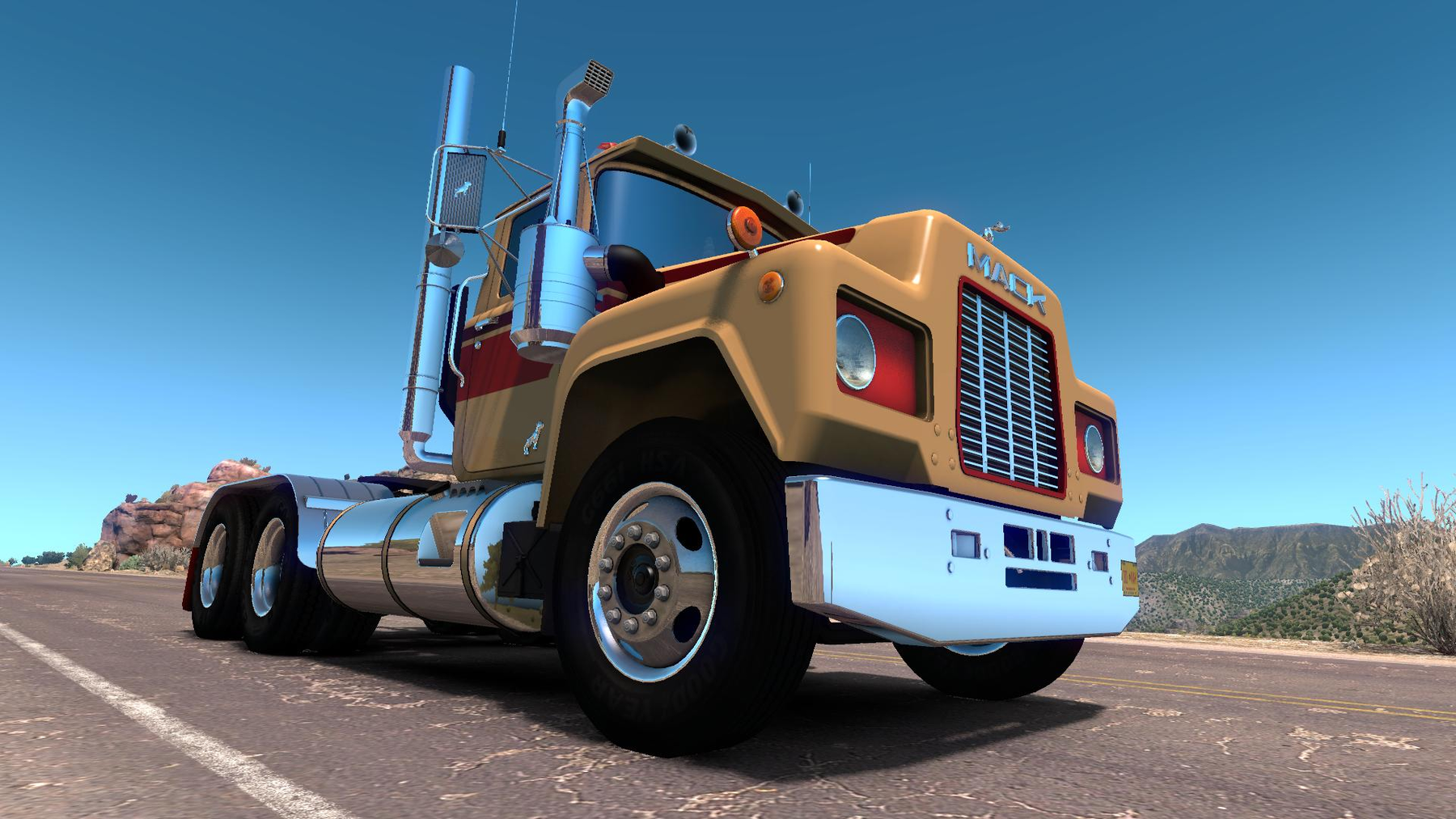 v1.2: - Added logging headache rack, - Added missing gear in Fuller RTF-12510 transmission, - Moved exhaust pipes a bit closer to the cab, - Fixed cab roof camera, - Added second horn adapter with roof horns moved a bit to the back, - Changed size and location of middle chassis collider to help with advanced coupling. Features: Real dimensions based on Mack specs, Real engines and transmissions with torque curves, ratios and other parameters, Fully animated detailed interior, All standard SCS truck features, like advanced coupling, trailer cables, etc. Detailed models based on many reference photos (thanks to Trayscapes and Google images), with reasonable triangle count which should not kill your GPU ;), Beautiful engine sounds made by Kriechbaum (6v92, Mack E6) and recorded by Trayscapes (Mack E6), Original paint jobs made by Lucasi, Pauly and me (not my wife this time, she's babysitting currently ;), No errors, no warnings and hopefully not conflicting with other mods (nah, there is always a poor mod that will break things ;) but not this one!), Next Gen Scania paintjob system (all skinnable parts have their own templates, except air cleaners, they are on the cab template), Currently only R600 hood with day cab. Can I finally go drive the truck and not write this silly description? ;) The truck is available at Kenworth dealers. About Maxitorque trnsmissions: I don't know of a shifter that will let you use some transmissions like they are supposed to be used (like TRTXL 1070 with 12 speed forward and 5 reverse). Please let me know if you came up with a custom shifter layout that is not very tricky to use. Some answers to common questions (sadly mostly negative it seems ;)): - It will currently not work in TruckersMP (unofficial multiplayer mod) but who know what are their future plans ;), - I will not add engines which were not used in this truck or which sound like broken washing mashine ;), - I'm not taking requests for mods or skins, - I will keep updating the mod with more features but don't expect frequent updates (apart from bug fixes) Included skins: - Pauly - "Rainbow Mack", "Red Velvet", "Mack Multi R" - Lucasi - "Retro Stripes Mack R", "Mack R Vintage Skin" - Harven - "Two Colors", "Road Warrior", "Three Stripes Metallic", "Value-liner" Credits: - Harven, Kriechbaum, Pauly, Lucasi, Trayscapes, RTA. About RTA commitment: The mod uses parts from RTA's Mack Superliner interior - namely: interior upholstery and interior cab body models. The rest of the interior is made from scratch, this includes: dashboard, all gauges, switches and knobs, labels, steering wheel with column and attached sticks, gear shifter, heater and seats, roof vent hatch, floor mats and pedals. All animations are also made from scratch. Not a single texture from the Superliner is used. I greatly reduced the number of triangles in the interior upholstery and interior cab body models. Credits: Harven, Kriechbaum, Pauly, Lucasi, |