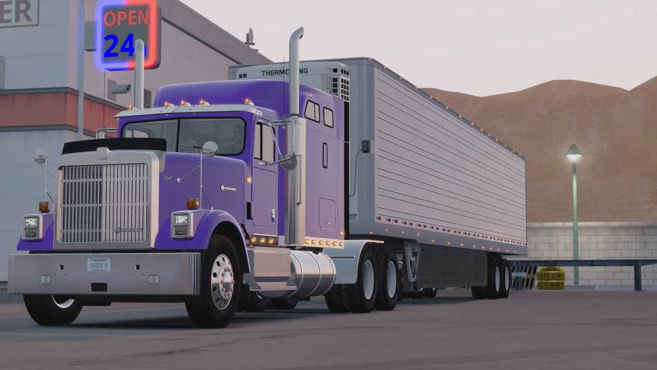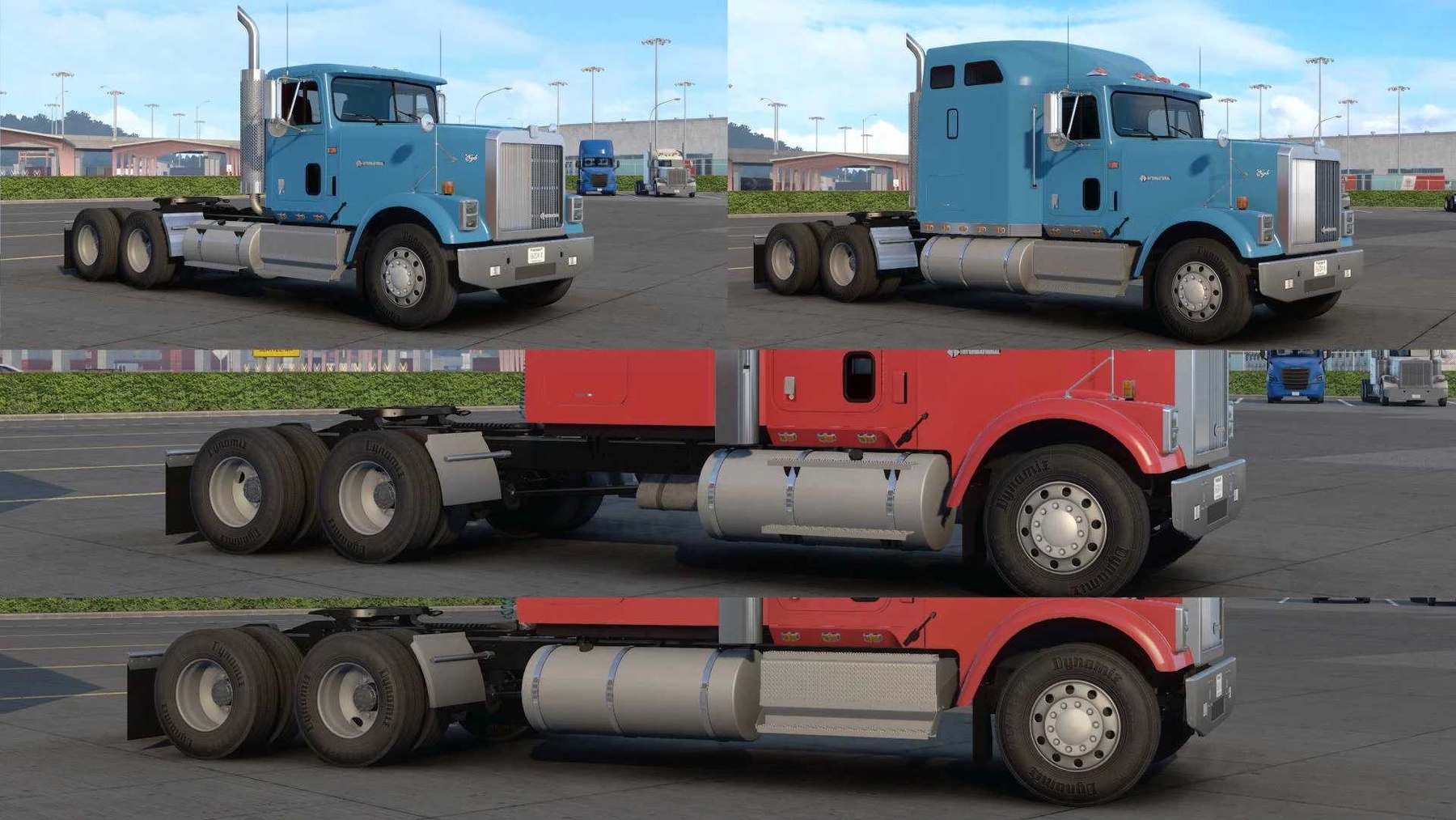 International 9900i edited to look like a 9300. replaced a bunch of the truck’s parts with my own models. Including the hood, cab front, visors, mirrors, battery boxes. The interior remains mostly the same as the 9900i, minus the adjustments necessary for it to fit the new cab shape. Those would be new door models, and new upper dash. I have not used any references for those, they’re improvised. What you get: – A new standalone truck – 2 cabs – 2 chassis per cab (rear tanks, front tanks) – new rear exhaust (plus all the 9900i exhausts) The rest is mostly the same as the 9900i. SCS - W900 roof wing, headlights and binkers; International 9900i Overfloater - models for cab front, wipers, visors, hood, mirrors, rear exhausts, battery boxes, tank steps, interior doors & upper dash Credits: Overfloater |