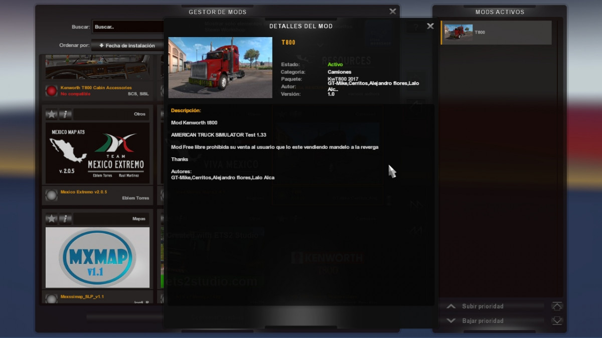 With this mod you get: -The Kenworth T800 truck with appropriate tuning parts. Hood was rebuilt and remodelled to match real truck as closely as possible. -3 cabs (for now) -so many chassis options that I won’t even bother with counting them :P -new, unique, real-life-accurate interiors -quite a bit of other tuning -a wide sellection of quality paintjobs Credits: GT-Mike,Cerritos,Alejandro flores,Lalo Alca Credits: GT-Mike,Cerritos,Alejandro flores |