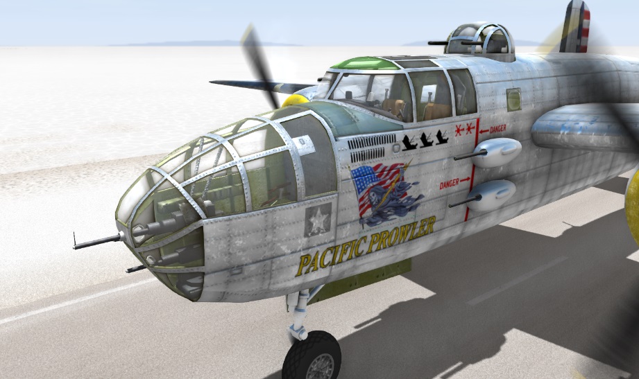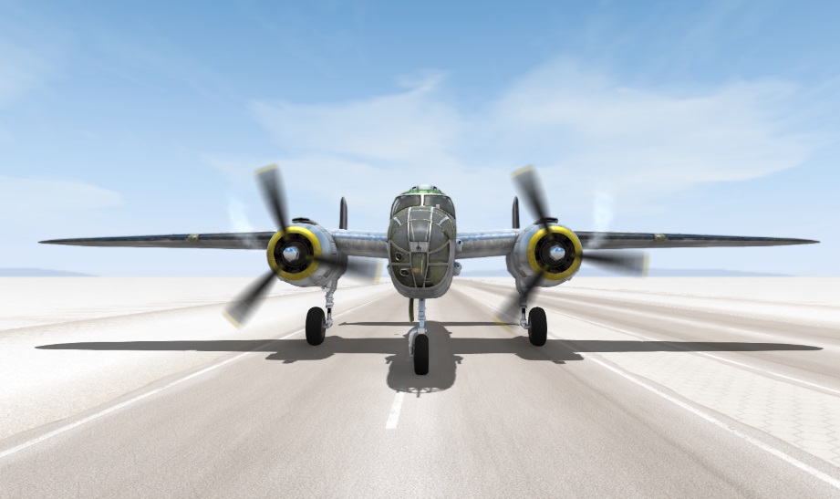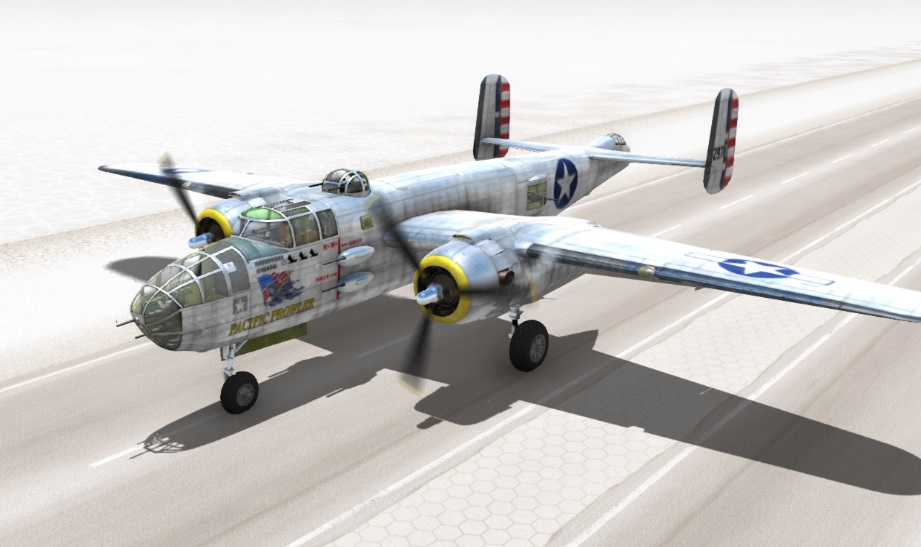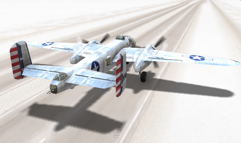 Thanks to Diamondback, B25Mitch and others for helping to revive the B25. Thanks to PrimeTheBomber for letting us use his liveries. New Editions: Spawning When spawning look for the motor rpm to stabilize, if they are slowing down hold V to restart the engines. Now you are ready to fly. How to fly: With the aircraft on the runway, Press M for Setting the flaps to takeoff position. Then Throttle up with T while Holding Z to hold position(Rb when using an Xbox Controller). Release the Brakes when the engine holds a steady Rpm. At 180km/h or above, pull up gently and take off. If using an XBox controller, pull the left stick down only half way to avoid a stall. If using a keyboard, tap the down arrow instead of a continuous press. The aircraft will try to nose down with the gear extended due to drag. Once above 220km/h, raise the gear by pressing N. When the aircraft reaches 300km/h, it will fly straight and level without input. At speeds above 300km/h negative pitch will be necessary to maintain level flight. Top speed is approximately 450km/h. Avoid full-deflection manoeuvring above 350km/h as this may result in structural damage. Instead, use half-strength control inputs (if using an XBox controller) or tap the controls if using keyboard. If you pull more than 4 G structural weakening will occur, and at 6G your wings will rip off. Landing: Reduce power to 30% and when reaching 250 Km/h press N to extend the landing gear Taxiing: Taxiing is accomplished by alternatively pressing T and G to keep speed below 50km/h.Try to avoid long periods of acceleration as the plane reaches high speeds fast. As in real life, there is no nosewheel steering so wheel brakes are essential for turning at low speeds. To make a full 180 degree turn, reduce speed to 10km/h, set idle throttle (G), turn fully to the left or right. The aircraft will pivot on the locked wheel and the nose wheel will caster. After the turn ensure the nose wheel is straight by taxiing forwards a few metres. Bombing: Select 4x500lb bombs from the Ordinance slot in the Ctrl-W parts menu. Open the bomb bay doors using , and press . to release bombs one at a time. Bombs will arm in mid-air when a certain distance from the aircraft, but may still be close enough to cause damage so ensure sufficient altitude to clear the blast. You can also try skip-bombing by releasing at very low altitude such that the bomb hits the ground before arming and embeds itself in the target from the side. The bomb will then explode after you overfly the target.
