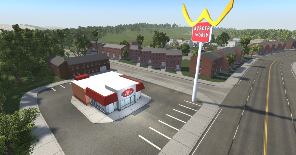 A few destinations such as BURGER WORLD and the popular and very familiar looking U-Pump-It gas station and some misc industrial buildings that didn't quite make a name for themselves yet.