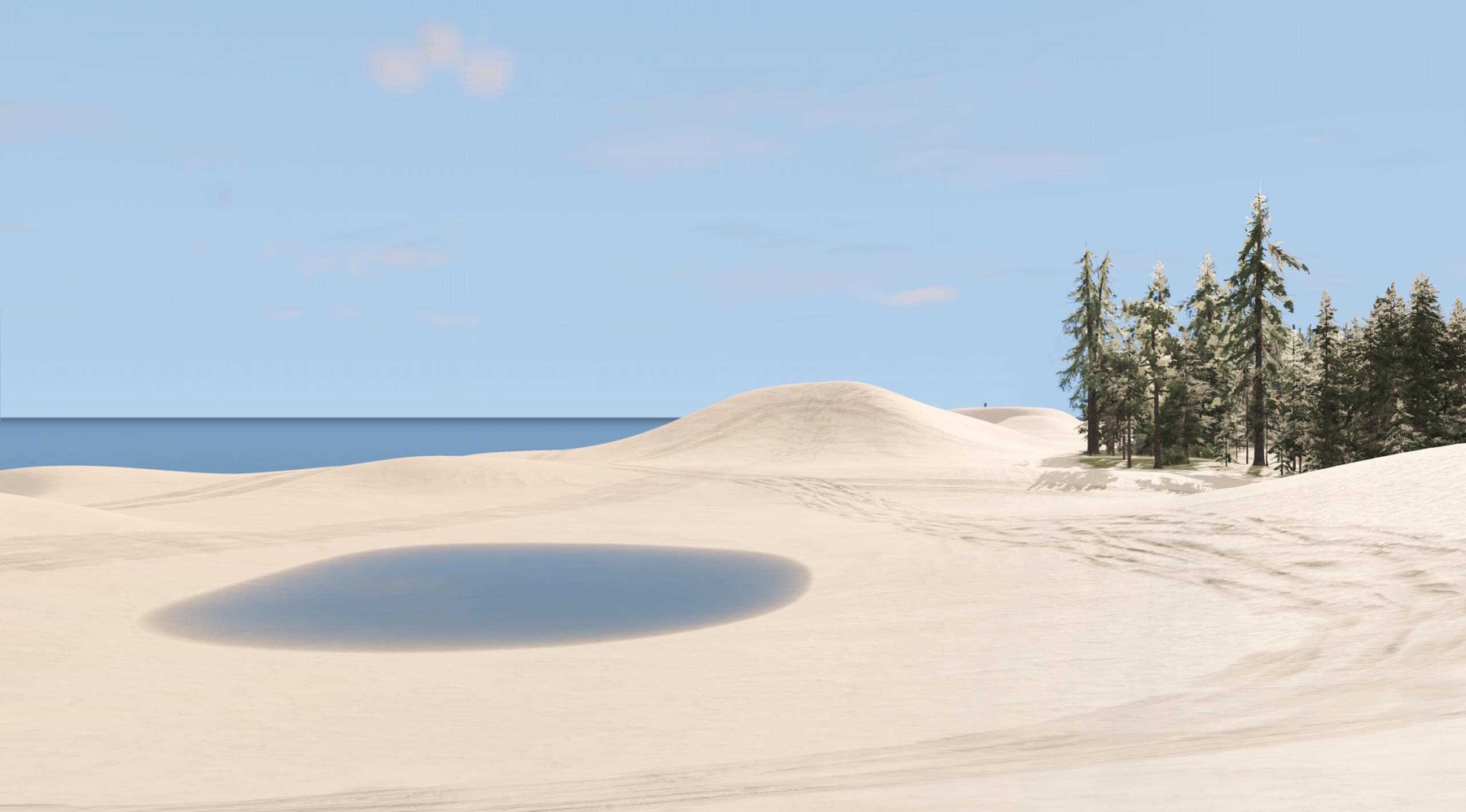 – Sand dunes. In the very south of the map along the ocean coast you will find massive sand dunes with giant jumps from dune to dune. To the northeast of the large open dunes are several wooded dunes similar to those on the Oregon coast. There are 50-100 trails winding through the trees in these dunes.