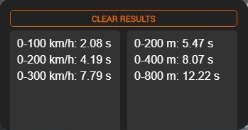 Test the speed and performance of your vehicles with this application. It allows you to measure and record the acceleration speed of 0-100 km/h, 0-200 km/h, 0-300 km/h, 0-400 km/h, 100-200 km/h, as well as the time during which you have covered a certain distance (up to 1.5 km). Credits: Karma_RGF |