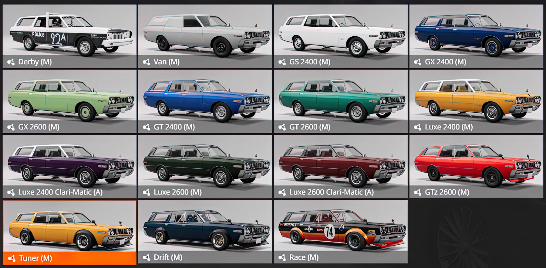 The 1976 Ibishu Claria is a rear—wheel drive station wagon with a hard roof, produced in Japan since 1976 and equipped with 2.4 L/C24 and 2.6 L/C26 Ibishu C-series engines. Many configurations were available at the factory: from the GS 2400, equipped with standard functions and hoods, to the GTz 2600, which was equipped with a Brewer C26 carburetor with a unique combination of red and white thin stripes, up to the Luxe 2600 Clari-Matic. equipped with a luxurious interior for comfort and a Clari-Matic gearbox to make driving as enjoyable as possible. Outside the factory, Claria was usually built for drift and car shows, rarely built for track racing.