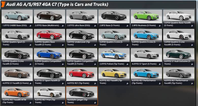 - All exterior options for the A7 C7 series (basic equipment, sports equipment, S-Line, S7, RS7) + Additional options such as trim color, badges, cameras and technological options