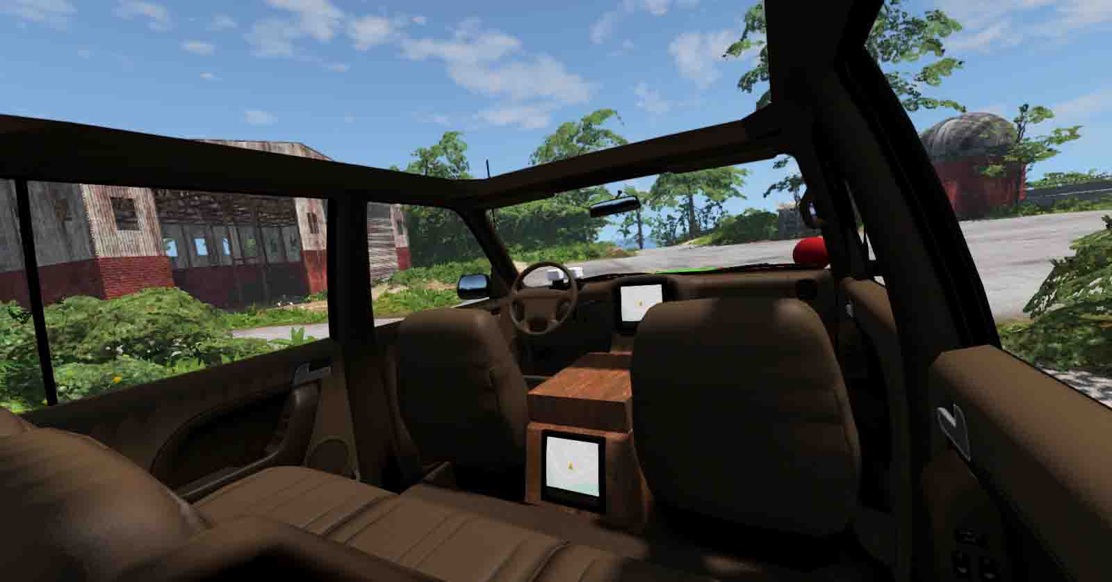 A custom interior with seats without head restraints, a modified dashboard with a new center console with 2 navigation screens for all passengers.