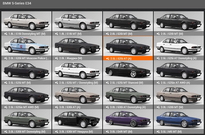 BMW E34. Pros: -Good appearance; -A good salon; -Working optics; -20 Configs; -Your wheels; -Restyling and Restyling; -Edited jbeam (skeleton); -Not bad damage. Cons: -Mod can reduce FPS (depends on PC) Credits: BobrEx |