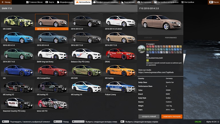 In general, there was no time to make it from scratch, but I will definitely do it. I took the old M5 F10 , added engines , stock kits before and after restyling , added new configurations and skins . Corrected some textures and conflicts with other models.J beam and handling remained from the old Credits: Smouk2 |