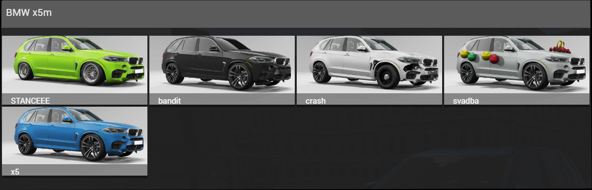 MOD BMW X5M V0.1 for BEAMNG.DRIVE Positive: 1) High-quality pbr texura 2) Fully working dashboard 3) 5 configurations 4) Your own JBEAM. Now it does not conflict with x5g05!! Credits: Vision Grand |
