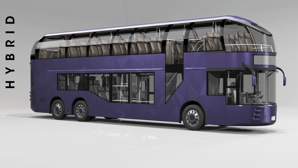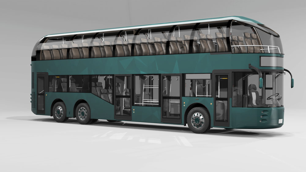 A double-decker bus in the shape of a capsule. It is supplied with left-hand drive (LHD) and right-hand drive (RHD).