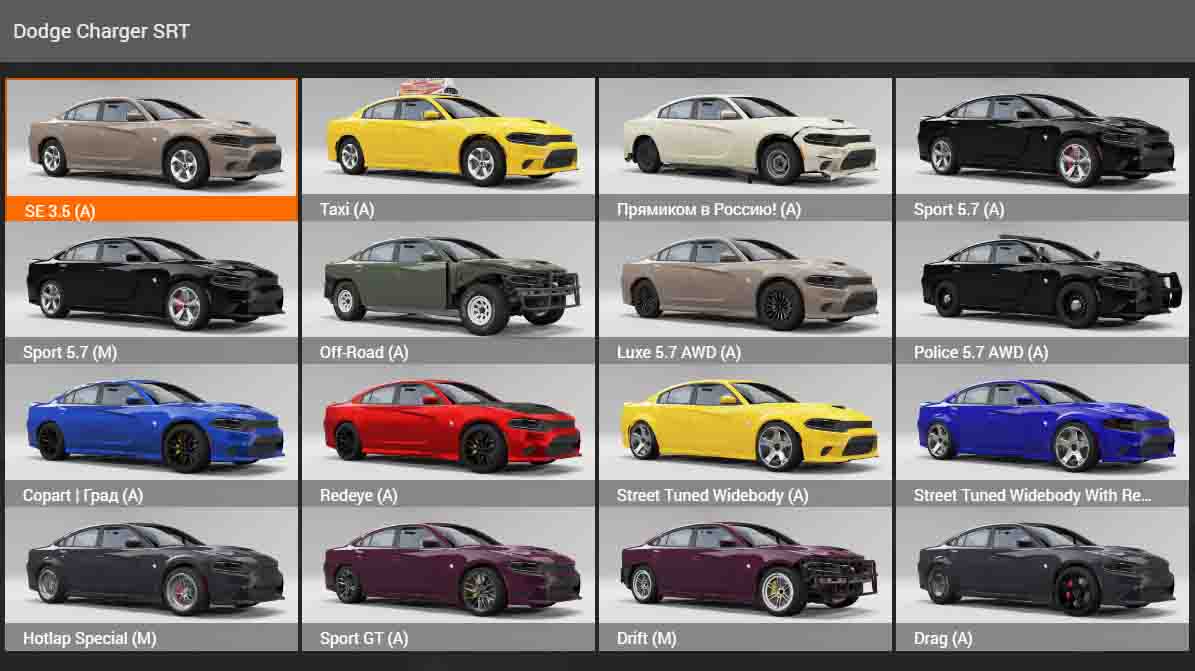 MOD CAR DODGE CHARGER SRT 2015 FOR BEAMNG.DRIVE Dodge Charger SRT 2015 There are enough configurations, including Redeye, WideBody, etc. Damage is average, one might say good.