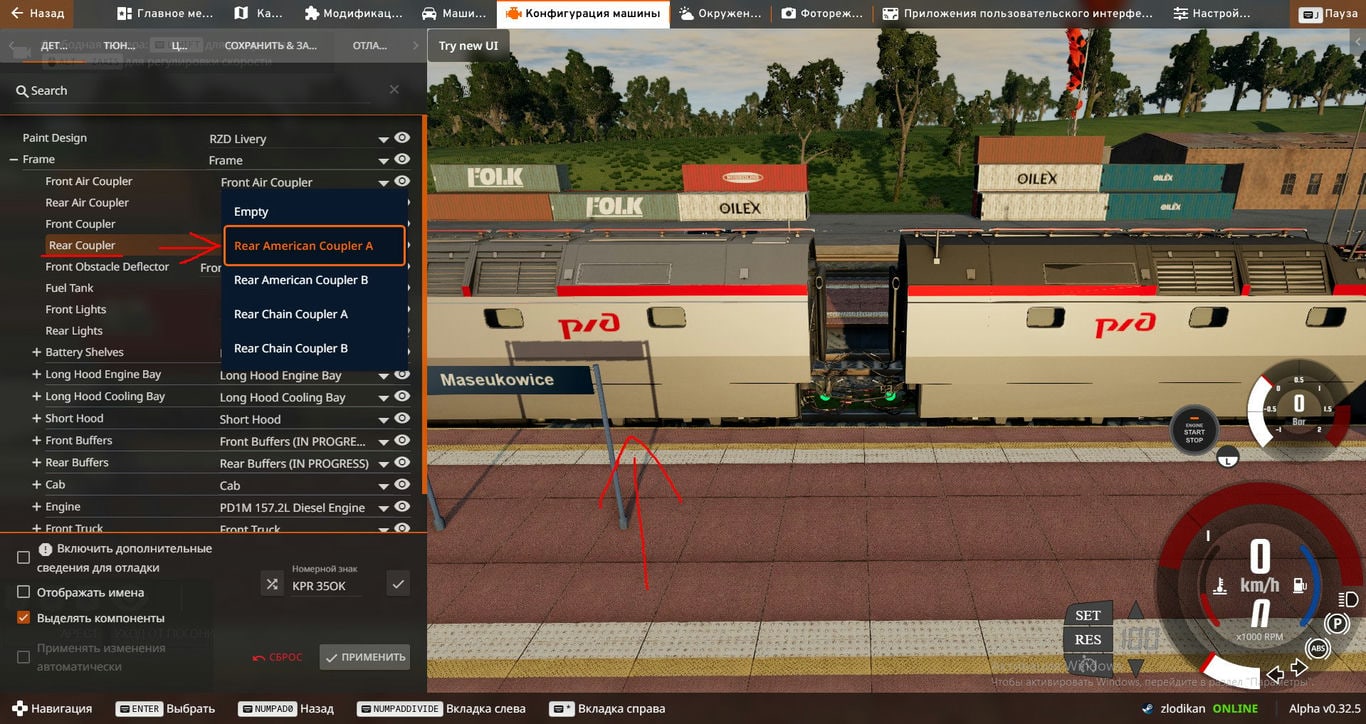 To pair one locomotive with another, create a second one and change the rear American hitch B to the rear American hitch A, press L on the main engine and reverse until the green circle disappears. In the linked state, it should look like in the last screenshot.