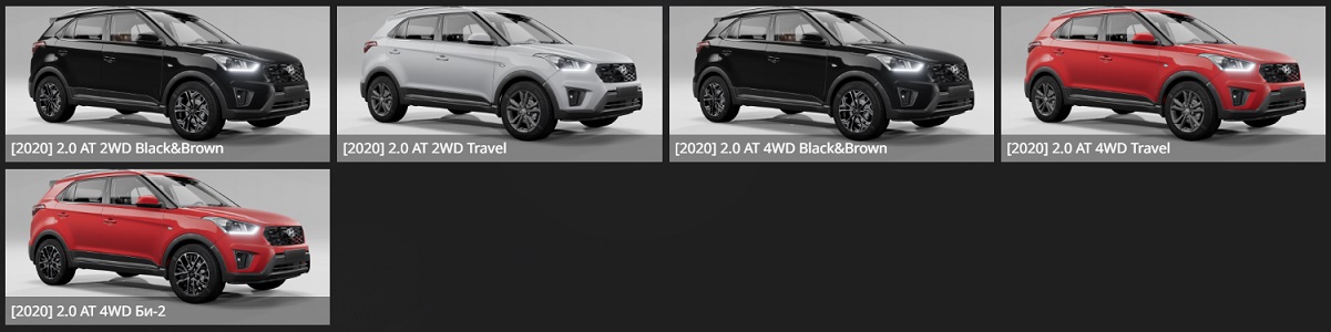 -JBeam like new cars (interior and opening doors) -Triggers in the cabin for emergency \ stabilization \handbrake \turning on the lamps inside. -37 configurations. -Animated manual transmission, pedals. -A working onboard computer. -A working phone in the cabin (turns on/off, shows the time, you can turn on the navigator; you can remove the details in the Phone slot) -5 types of disks + caps; bumpers from ix25(2018)\[en] Creta(2015-2020); radio\navigator in the cabin with different climate control. -2 types of engines. -PBR materials. Flaws: poor shading after cutting the model; the hood can close itself Credits: kws |