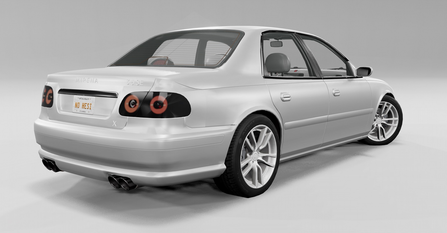 Inspiration: Nissan Maxima (based on the Pessima, the equivalent of the Nissan Altima in BeamNG), Infiniti G and M for the longitudinal arrangement of the engine.