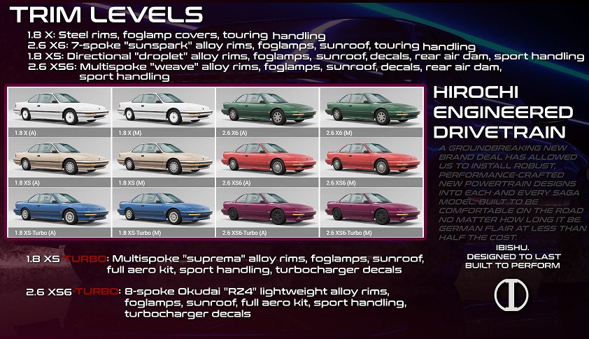 Ibishu sports flagship for grand tourism of the late 80s.Ibishu Saga 1987-1991. flagship GT sports coupe with a rigid roof from Ibishu. Its chassis design, interior and stylistic elements later seeped into the lineup and made their way into the 1st generation Ibishu Pessima when Saga finished its production cycle. The Saga is equipped with two engines: a 1.8-liter H4 and a 2.6-liter H6 in the FR layout. Both engines were designed and developed by Hirochi as part of a collaboration with the brand. None of the engines saw any other Ibishu applications after Saga, although presumably appeared in other Hirochi models of the time. Credits: Kueso |