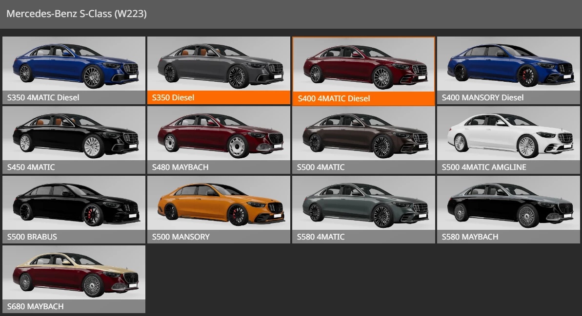 Mod MERCEDES BENZ W223 2022 for BeamNG.drive 1. 100% Jbeam; 2. Interior lighting; 3. Working pedals, turn signal and steering wheel; 4. 13 configurations; 5. PBR textures; 6. Working light. Credits: TriX |