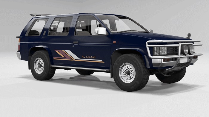 In version 1.0.7: Nissan Terrano WD21 for BeamNG. Made as high-quality as possible. Alpha version! Not everything can work as it is supposed to. There are several configs and a certain amount of tuning. The model is of almost maximum quality, on weak PCs it will most likely devour the entire FPS. The mod will be finalized. Credits: JNR231 |