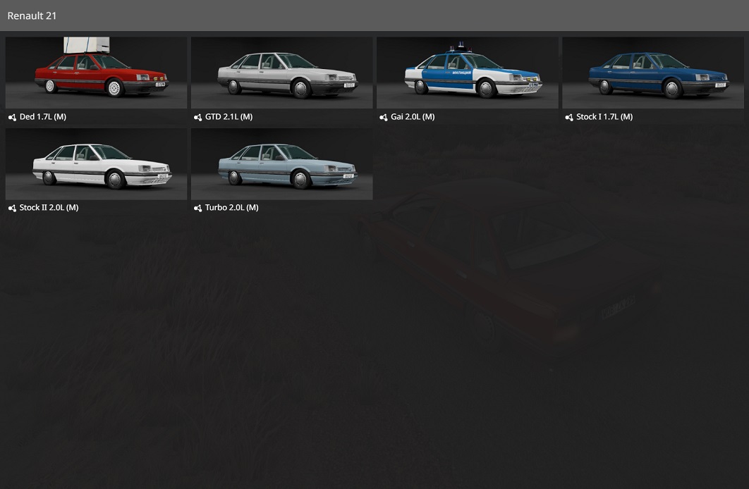 Mod car RENAULT 21 for BeamNG.drive Working lights, cleaning. Animations of details by the type of gearbox lever, not a lot of configs. Normal damage. Drop-down windows (to open windows, replace the usual ones with an openable in the parts selector). Credits: Bagusik |