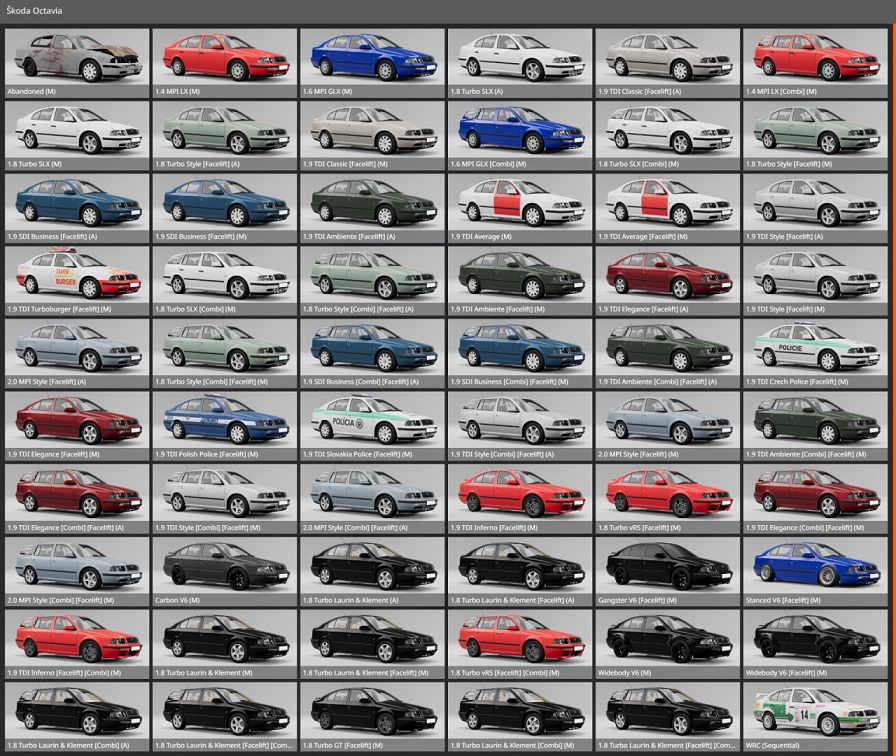 Mod Škoda Octavia MK1 1.0 for BeamNG.drive this mod might have some bugs, i will NOT fix them and i will NOT update this mod -PBR -good underbody -60 configs -custom wheels -5 interior colors -realistic engines with custom sound -edited jbeam (its not the best tho) -a lot of custom parts -you can make your own skins, uvs are in "skins" folder -many sets of wheels -both sedan and combi, pre-facelift and facelift -a lot more Credits: KUBA |