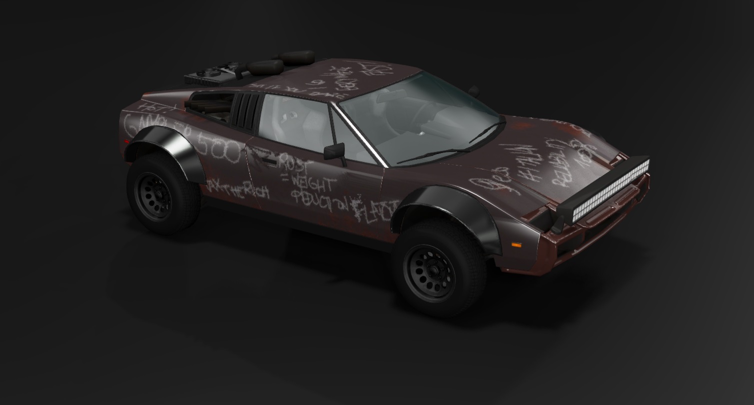 A car rescued from a landfill with some custom parts and parts from other cars.