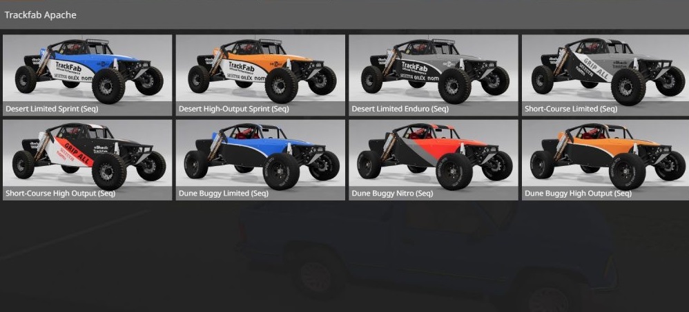 Mod Trackfab Apache v1.01 for BeamNG.drive In version 1.01: Light buggy ready for desert racing. Based on the lightweight 4-cylinder buggies commonly used in desert racing, the Trackfab Apache is a light rear-wheel drive buggy equipped with a 2-liter engine borrowed from the Pessima. Even with a power of just under 200 hp as standard, the weight of less than 1000 kg combined with more than 20-inch suspension travel makes it quite fast in the open desert. For those who want more power, the internal structure of a tourist car and nitrous oxide allow you to bring the power to an unacceptable level. Credits: TrackpadUser |