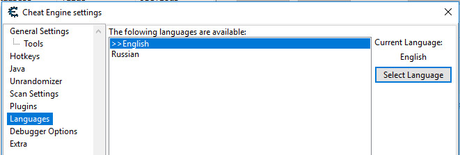 Select the "Languages" menu, then select "Russian" and press the "Select Language" button. Restart Cheat Engine. |