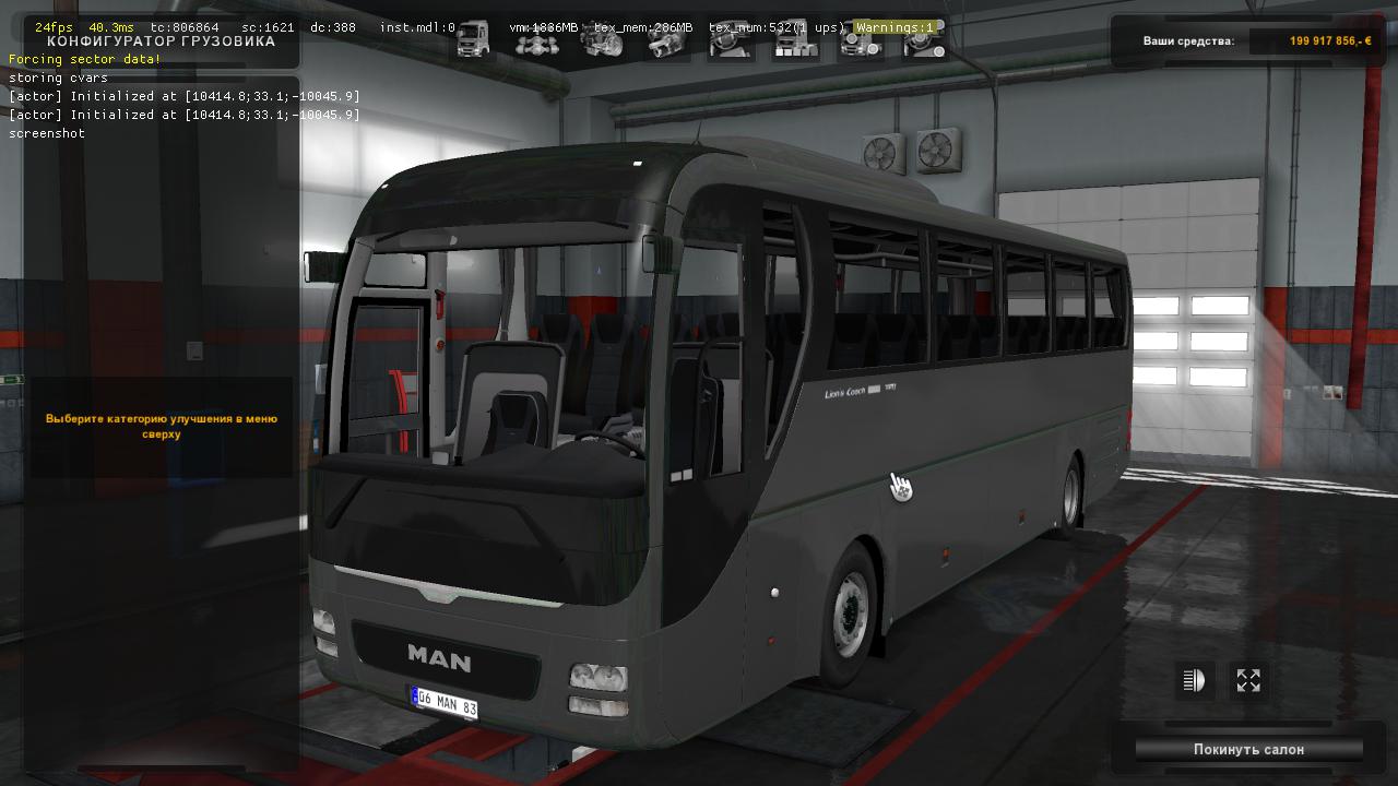 The bus is standalone. Acquired in MAN. Available for purchase from level 0. - Your interior. - Dashboard and trip computer from MAN TGX. - Your sound. Some sound files from Avanuel. - Partial animation of the buttons on the dashboard (alarm button, direction indicator switch, retarder and headlight switch. There is also an animation of the parking brake valve and wipers on the windshield. The wipers are animated from the inside and outside, erase raindrops and have two speed modes) . - 10 skins in a separate mod (Man Lion Coach Skin Custom Pack). - One chassis, 4x2. - One engine, 420 l / s. - One 6-speed MAN TipMatic gearbox with retarder. - No support for DLC (Cabin Accessories, National Window Flags). Credits: Kaptan06, Kadir Yagiz, Metehan Bila |