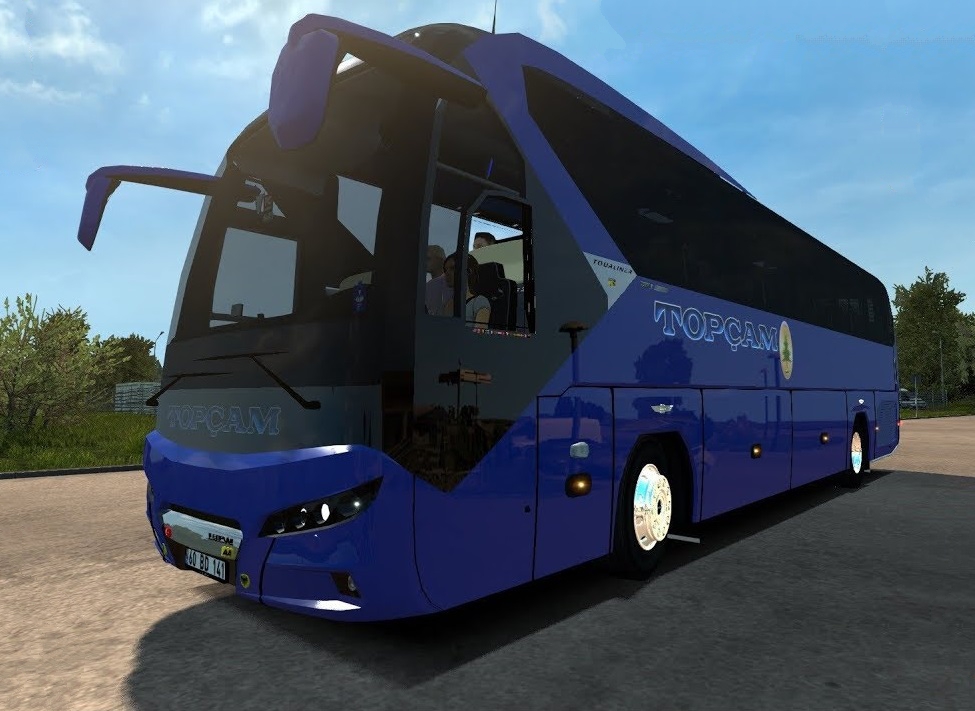 The Neoplan Tourliner bus mode for ETS 2 has been released with openable doors, windows and luggage. 1 cabin type and 1 chassis type are available. Compatibility for FMOD sound engine has been added. Openable front right door and glass animation added. Openable tailgates added. New realistic interior model added. Realistic suspension added. New accessory parts added. 17 new skins added. Luggage covers are selected open from the service. While the left window of the bus is descending with the left glass opening button, the right door is opened with the right glass opening button. You should create the vehicle by choosing various skins suitable for the body. There are also various accessories. Luggage loads are added separately. Passengers and crew are also added separately. Credits: Polat Yıldıran |