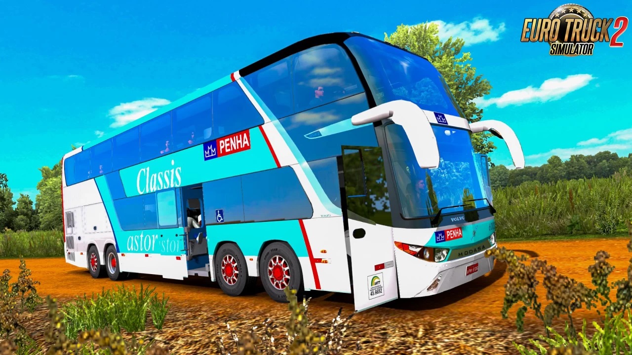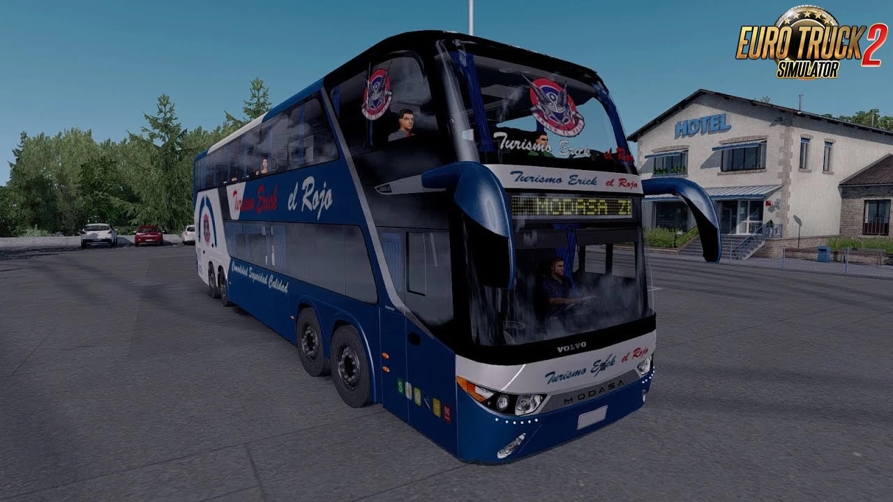Volvo Modasa Zeus 3 8x2 - this mod adds a high quality long four-axle coach bus mod from Volvo for ETS2 players. Very well done, both inside and out. Can carry passengers. The Modasa Zeus 3 bus mod for Euro Truck Simulator 2 is built on a chassis with an 8x2 wheel formula, the ETS 2 simulator player has four engines with power from 420 to 750 horsepower and a pair of gearboxes for twelve gears. If desired, the virtual driver is provided with an alternative to tinting windows, placing passengers in the cabin, adding LED running lights and some other pleasant little things. Features bus Volvo Modasa Zeus 3 8x2: - independent bus model - High quality 3D model - High quality detailed exterior - High quality detailed interior - the model has own interior - the model has own sound - the model has own wheels - passangers seats - present the illumination of arrow speedometer and tachometer - the character is correctly sitting in the driver's seat - the choice of engine power - the choice of transmission and gearbox - the choice of wheels configuration - choice of color body / metallic paint / skins - correct position of the Volvo logo - Working headlights, brake lights, tail lights, front and rear turn signals, steering wheel and reverse signals; - The correct position of the player - Supports all major functions of the game - buy from Acces Mod dealer Tested on game version 1.38.x Ronald Cruz, Fabian Espinoza, Rafael Rodrigues, Paulo Marcos, Jorge Maystro, Leon DG, BusoLOGames Credits: Ronald Cruz, Fabian Espinoza, Rafae |