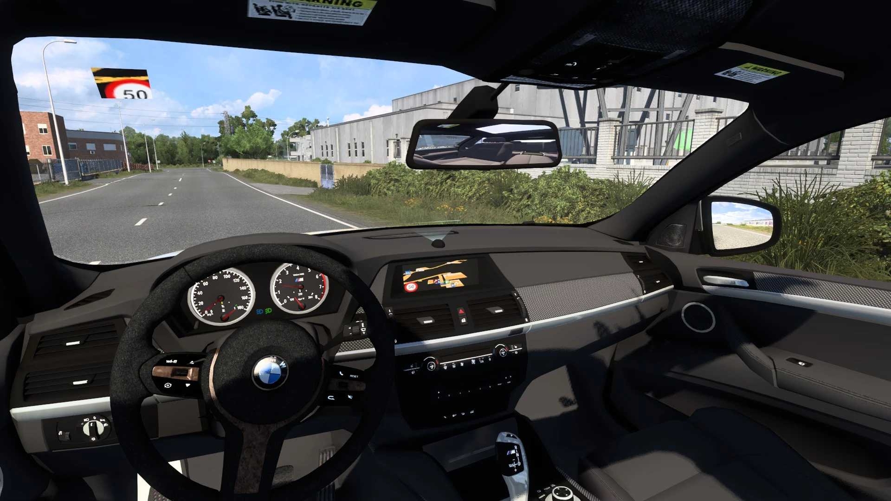 Added window animation Fixed wipers Fixed bug with mirrors Added the ability to paint in metallic Added spray from under the wheels The new mod of the German luxury crossover BMW X6 for Euro Truck Simulator 2 will perfectly complement the section of the site with passenger vehicles. This modern car combines all the features necessary for an SUV (high ground clearance, four-wheel drive, high-torque internal combustion engine) and obvious external signs of a sports coupe. Even though the BMW X6 was built for outdoor activities and not for making money in the ETS2 simulator, you will be able to use the new crossover as you see fit. The new BMW X6 can be useful for exploring unknown terrain or for transporting orders because a small trailer comes with mods. The virtual BMW X6 cannot boast of extensive tuning, but the mod has a number of positive features. A beautiful body model and the ability to paint in any color or color scheme (metallic), high-quality interior with a fully functional dashboard (speedometer, tachometer, headlights, fuel, water, etc.), original BMW alloy wheels. In addition, adequate physics is prescribed and a set of sounds has been added. FurkanSevke, fix, vovangt4 upgrade Worked on the model in 1.45: Master_Yoda. Car Reconstruction Help: Funyash Adaptation to 1.45 - 1.46: AJIEHA Credits: AJIEHA |