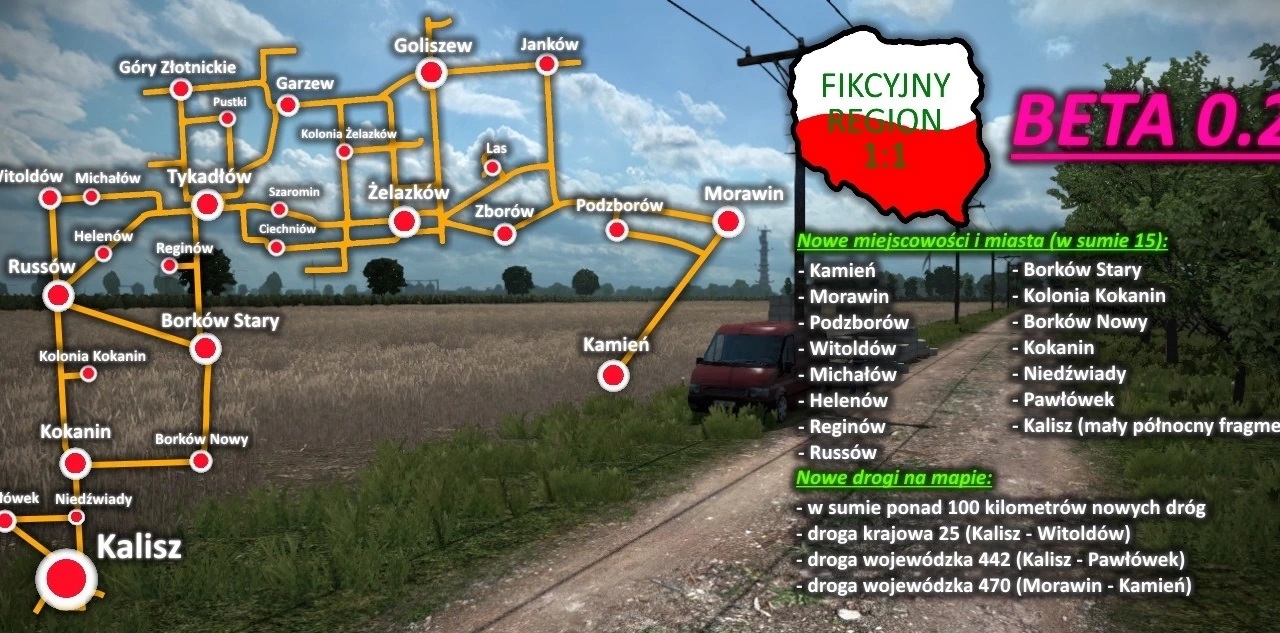 Fikcyjny Region - this mod add a map of Poland in the scale of 1: 1, focusing (for now) on the area of the Kalisz poviat. The map is offline, when creating a profile, select the polska.mbd module. Features mod Fikcyjny Region: - scale map is 1:1; - There is a ferry to Bydgoszcz; - polish climate, villages, roads; - cities added: Witoldów, Kamień, Morawin and Michałów; - important churches added for every region; - required all Maps DLC's. Changes in v0.11: – some bugs fixed, including holes. – no orders to Witoldów, Kamień, Morawin and Michałów. – temporary liquidation of the portal to Bydgoszcz. Tested on game version 1.38.x Credits: Jakubek, Piotrek |