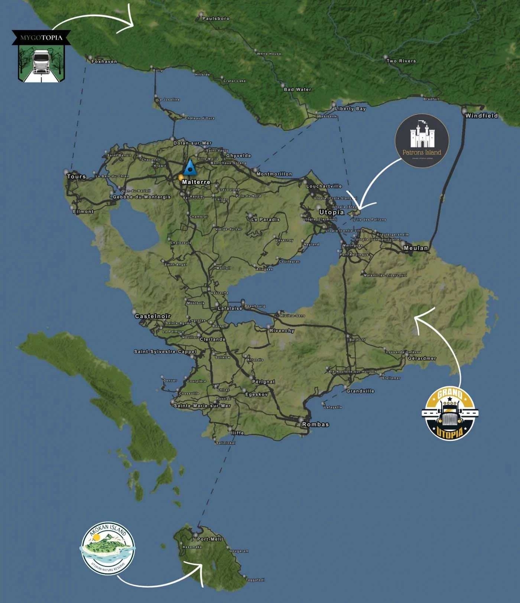 Mygotopia Map is an official addon for Grand Utopia It unlocks a brand new country located in the north of the island of Grand Utopia. This new country is not inspired by France. This time, I let my imagination run wild to offer you a different kind of immersion, in a fictional nation that could be situated halfway between American and European culture. Mygotopia is a vast country, synonymous with wide open spaces. The fact that this map is created on a continent instead of an island means that there is more space between towns and villages to create more beautiful and realistic landscapes. Good to know, the official language in Mygotopia is English (not French!).Credits MyGodness Credits: MyGodness |