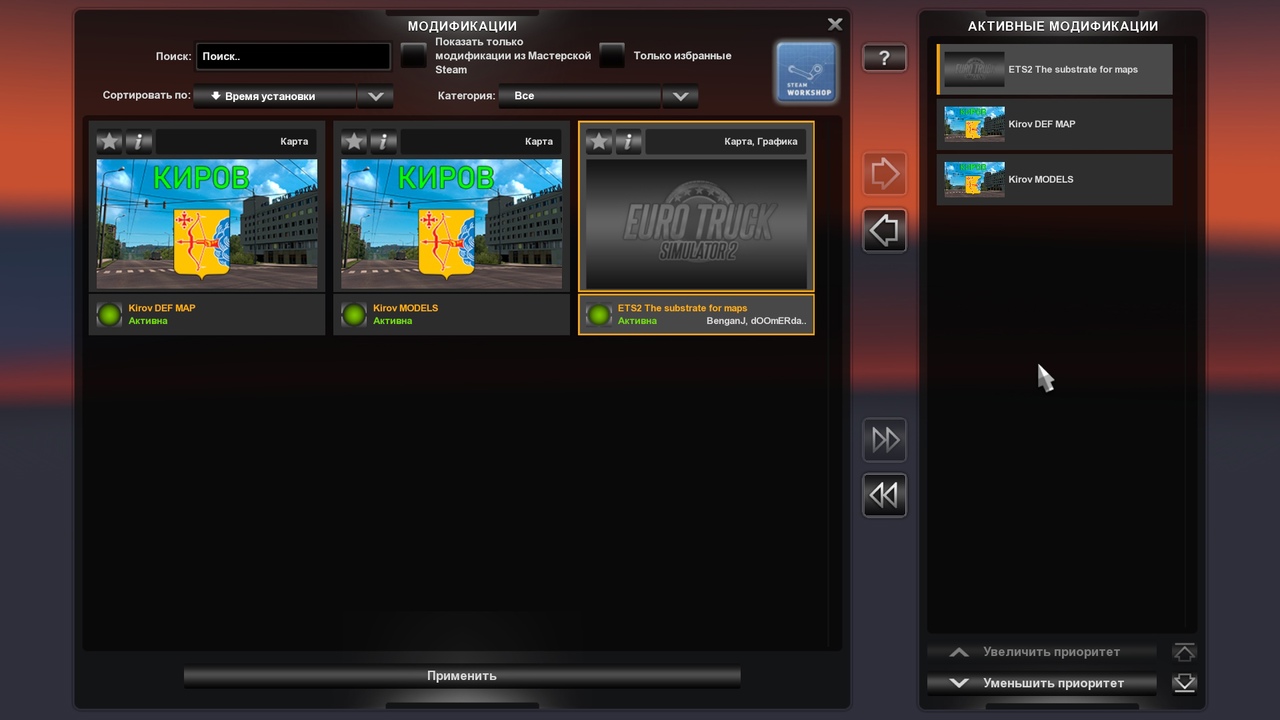 Open beta testing of the map Kirov and Kirovskaya oblast for ETS 2 has started. This is a crude version, to collect maximum feedback, so that further work would be easier! Want to help modify? Write your feedback / request / criticism in the discussion or comments Scale: standard (1:19) Required DLC: All DLC on maps, except for Iberia DLC Download / install order: 1) Colored background of the continent6 any, you can do without it 2) models_kirov: link 1 - https://sharemods.com/y3e3dsrz9aiu/models_kirov.scs.html 3) map_kirov: link 2 - https://sharemods.com/4vfdpz4grbh3/map_kirov.scs.html The map is completely independent and shouldn't cause any conflicts with any other mods. Not a single file of the standard game has been replaced, everything is different Creating a new game profile is NOT REQUIRED Options for getting to the region: 1) Ferry from St. Petersburg (seen on the map) 2) Buy a garage 3) Console and goto kirov Download two links: map and models Authorship: Team Kirov Credits: Team Kirov |