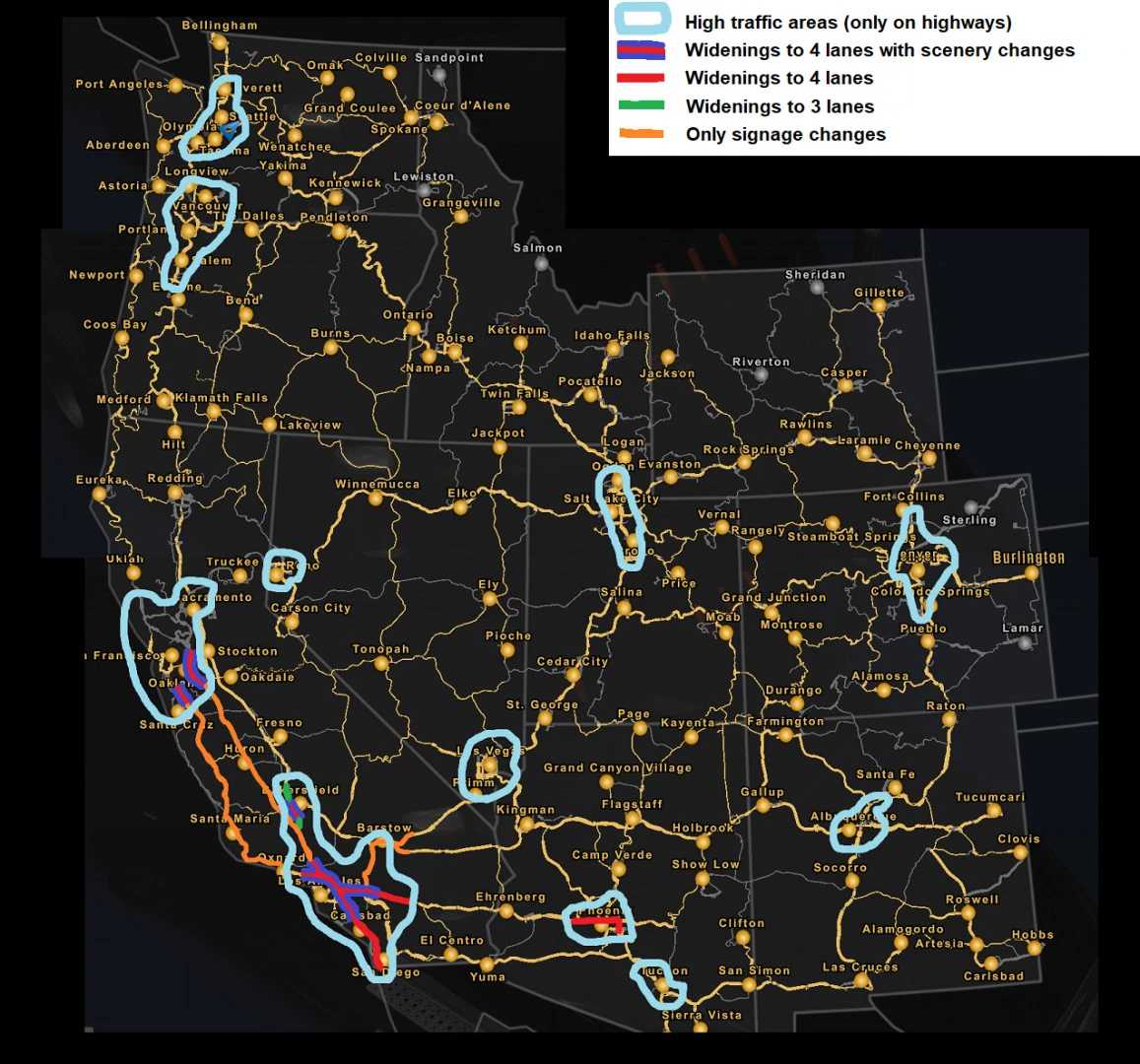 Changelog v14.2 Some fixes for a few signs with broken fonts, nothing game-breaking. Most importantly, scenery around the US 101 in the Bay Area has been reworked, trying to replicate the San Jose area more accurately. Sadly, the weird tiny road linking Santa Cruz directly to the I-5 had to go for that. I-5 widened to 2×4 from San Diego to just north of Los Angeles (originally a mix of 2×2 and 2×3) I-5 narrowed to 2×2 from Sacramento to Redding (originally 2×3) I-10 widened to 2×4 from Los Angeles to Palm Springs (originally 2×3 and 2×2) US 101 widened to 2×4 in the Bay Area and near Los Angeles (originally 2×2 and 2×3 respectively) I-580 (the California one) widened to 2×4 from the I-5 junction to Richmond (originally 2×2) I-80 widened to 2×4 from Richmond to SR37 and 2×3 up to Sacramento (originally 2×2) CA-99 widened to 2×3 near Bakersfield and 2×4 in Bakersfield (originally 2×2) Some very minor signage changes, mostly getting rid of “Carlsbad” being posted everywhere. Areas near Los Angeles, the SF Bay area and Sacramento more “urbanized” Downtown Los Angeles remodeled. Credits: Quaristice |