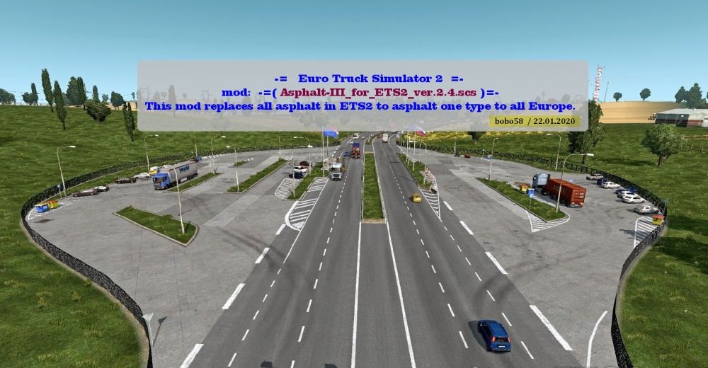 -= Euro Truck Simulator 2 =- mod: -=( Asphalt-III_for_ETS2_ver.2.4.scs )=- This mod replaces all asphalt in ETS2 to asphalt one type to all Europe. by bobo58 / 22.01.2020 Credits: bobo58 |