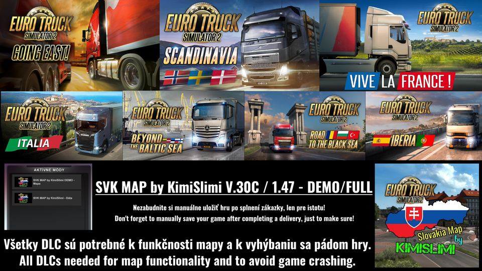 Hello, my name is KimiSlimi and I’m is creating a Slovak map for the whole SCS Europe for the game Euro Truck Simulator 2. I’m glad, that you are reading this file, because you always find there basic informations about map = how to install a map, changes and updates, or what’s preparing for the future. !!! For the correct functionality of the map and all models, I recommend playing with all map DLC = Going East, Scandinavia, France, Italy, Baltic Sea, Black Sea and Iberia !!! Map – DEMO: – 20 cities in Slovakia (Bratislava, Malacky, Trnava, Nové Zámky, Nitra, Nováky, Prievidza, Žilina, Ružomberok, Banská Bystrica, Brezno, Poprad, Spišská Nová Ves, Rimavská Sobota, Košice, Michalovce, Prešov, Vranov nad Topľou, Humenné, Snina) – 1 city in Ukraine (Velykyi Bereznyj) Map – FULL: – 36 cities in Slovakia (Bratislava, Malacky, Trnava, Galanta, Šaľa, Nové Zámky, Levice, Nitra, Nováky, Prievidza, Trenčín, Považská Bystrica, Žilina, Ružomberok, Banská Bystrica, Zvolen, Brezno, Čierny Balog, Korytárky, Rimavská Sobota, Červená Skala, Poprad, Spišská Nová Ves, Levoča, Stará Ľubovňa, Sabinov, Košice, Trebišov, Michalovce, Sobrance, Prešov, Vranov nad Topľou, Strážske, Humenné, Snina, Stropkov) – 3 cities in Ukraine (Uzhhorod, Velykyj Bereznyj, Uzhhok) How to install the folder? – open archive “SVK MAP by KimiSlimi V.30C – 1.47 – DEMO/FULL.rar – extract the europe.scs and data_kimislimi.scs file and move it into My Computer/Documents/Euro Truck Simulator 2/mod – I recommend to choose a new profile + without other map mods, because the game may crash – when creating a new profile, go to the “Correct modification” menu and double-click on the “SVK MAP by KimiSlimi – Mapa” a “SVK MAP by KimiSlimi – Dáta” windows and it will be in active mods and click on “Confirm changes” – You have the map ready and all you have to do is follow the damn road with truck…no that was a joke = only play it! Changes in the V.30C update: (pic. 1,2,3) Generally: – FIXED GAME CRASHING! – added 6 cities – Galanta and Trebišov (returned from the older version), Považská Bystrica, Vranov nad Topľou, Strážske and Humenné (rebuilt from the ground up) – adding new navigation signs for highway intersections and rest stops (D1, D2, D4, R1) – modification of most of the old Czechoslovak street lighting on all main roads and highways with energy-saving and white LEDs (except in some places) – addition of two border crossing villages in eastern Slovakia – Ubľa and Tibava – adding new navigation signs and welcome boards of towns and villages in Hungarian and Rusyn language – rebuilt road between Prešov and Humenný towards Lublin (PL) – cancellation of the trip to the city of Senica due to reconstruction – moving all 3 Ukrainian cities to the correct geographical locations and detailing them (more road signs, trees,…) – modification of some traffic signs, roads, roundabouts and errors Bratislava: – added bypass D4 in the direction from the Austrian border to the connection to D1 – updating public lighting in Bratislava to LED – added navigation boards for companies Posped, Fle, RT Log and BHV What is planned in the future? – the last stage of the city of Bratislava = Staré Mesto, Center – add the cities of Bardejov Komárno, Dunajská Streda, Holíč and rebuild Senica – remodel the oldest cities in Slovakia from 2018/2019 (e.g. Šaľa, Nitra, Brezno, Poprad) – redevelop the city of Ružomberok, Zvolen and Banská Bystrica – correct most of the errors in central and eastern Slovakia How do I recommend playing map? – If you are on a laptop, I recommend having it plugged in for a better map-playing experience – visual settings are best at “High” Buying a FULL version: – You can by the FULL version by Paypal or by “transfering to my bank account”, but first, before payment, you should contact me on Facebook! – the map costs €10 or $10.92 for 365 days from the day you buy map (from 2024 the price will be changed to 5€) = I will automatically send you every update to a personal chat or I create a VIP group on Facebook and there you will be able to download a map in a time interval Financial support: – if you want to support me, the same rules apply as when purchasing the FULL version of the map – voluntary contributions or donations can be sent to me on a voluntary basis to Paypal or to the account number (listed at the end of this text) – if you buy the FULL version, you can add donate on a voluntary basis License Terms: – it is FORBIDDEN to manipulate with the files in the map in any way, edit the map, publish it as your own – or sell, change the downloading link for the DEMO or FULL version of the map or otherwise distribute the link to the FULL version without paying all those who use it! – if you find something suspicious, please report it to me via facebook immediately! Credits: KimiSlimi |