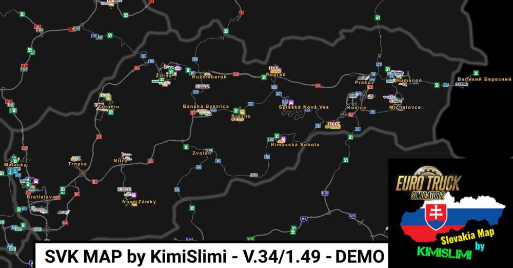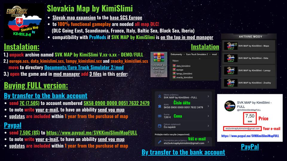 Hello, my name is KimiSlimi and I’m is creating a Slovak map for the whole SCS Europe for the game Euro Truck Simulator 2. I’m glad, that you are reading this file, because you always find there basic informations about map = how to install a map, changes and updates, or what’s preparing for the future. !!! For the correct functionality of the map and all models, I recommend playing with all map DLC = Going East, Scandinavia, France, Italy, Baltic Sea, Black Sea and Iberia !!! Map – DEMO – V.34: – 18 cities in Slovakia West Slovakia (6): (Bratislava, Malacky, Trnava, Trenčín, Nové Zámky, Nitra) Central Slovakia (6): (Žilina, Ružomberok, Banská Bystrica, Zvolen, Brezno, Rimavská Sobota) East Slovakia (6): (Poprad, Spišská Nová Ves, Košice, Michalovce, Prešov, Humenné) – 1 city in Ukraine (Velykyj Bereznyj) Map – FULL – V.34: – 40 cities in Slovakia West Slovakia (14): (Bratislava, Malacky, Trnava, Senica, Myjava, Nové Mesto nad Váhom, Trenčín, Galanta, Šaľa, Nové Zámky, Nitra, Nováky, Prievidza, Handlová) Central Slovakia (11): (Žiar nad Hronom, Považská Bystrica, Žilina, Ružomberok, Banská Bystrica, Zvolen, Brezno, Čierny Balog, Korytárky, Rimavská Sobota, Červená Skala) East Slovakia (15): (Poprad, Spišská Nová Ves, Levoča, Stará Ľubovňa, Sabinov, Košice, Trebišov, Michalovce, Sobrance, Prešov, Vranov nad Topľou, Strážske, Humenné, Snina, Stropkov) – 3 cities in Ukraine (Uzhhorod, Velykyj Bereznyj, Uzhhok) How to install the map properly? 1.) Unpack archive named SVK MAP by KimiSlimi V.xx-x.xx – DEMO/FULL 2.) Files europe.scs, data_kimislimi.scs, lampy_kimislimi.scs and znacky_kimislimi.scs move to directory Documents/Euro Truck Simulator 2/mod 3.) Open the game and in mod manager add 3 files active in the order written in 2nd pharagraph 4.) You have the map ready and all you have to do is follow the damn road with truck…no that was a joke = only play it! Changes in the V.34 update: (pic. 1,2,3) – added 2 new cities (Myjava, Nové Mesto nad Váhom) – rebuilt 2 old towns from scratch (Trenčín, Senica) – added a smaller part and bypass of the city (Trnava) – added connection between Bratislava and Malacky together with the Bratislava connection via Most SNP – redesigned D1 interchange with route 18 in front of the city of Prešov – added the eastern part of the city of Humenné – fixed many errors along with redesigning many sections in the map – update to game version 1.49 What is planned in the future? – the last stage of the city of Bratislava = Staré Mesto, Centrum – add the cities of Bardejov, Komárno, Dunajská Streda, Holíč and complete the cities of Trnava and Levice – rebuild the oldest cities in Slovakia from 2018/2019 (e.g. Nitra, Poprad, Šaľa, Galanta, Brezno…) – rebuild the city of Ružomberok, Zvolen and Banská Bystrica – replace all old traffic signs and lamps with new ones How do I recommend playing map? – If you are on a laptop, I recommend having it plugged in for a better map-playing experience – visual settings are best at “High” Buying a FULL version: 1.) via TRANSFER to the to account numbered – to note write your e-mail, to have an abbility send you map – updates are included within 1 year from the purchase of map Financial support: – if you want to support me, the same rules apply as when purchasing the FULL version of the map – voluntary contributions or donations can be sent to me on a voluntary basis to Paypal or to the account number (listed at the end of this text) – if you buy the FULL version, you can add donate on a voluntary basis License Terms: – it is FORBIDDEN to manipulate with the files in the map in any way, edit the map, publish it as your own – or sell, change the downloading link for the DEMO or FULL version of the map or otherwise distribute the link to the FULL version without paying all those who use it! – if you find something suspicious, please report it to me via facebook immediately!Slovenská Sporiteľňa If there is any problem or you would like to report a map error, please contact me immediately on Facebook, I’m still just improving the map. I wish you many happy kilometers and experiences from playing my Slovakian map. /KimiSlimi Credits: KimiSlimi |