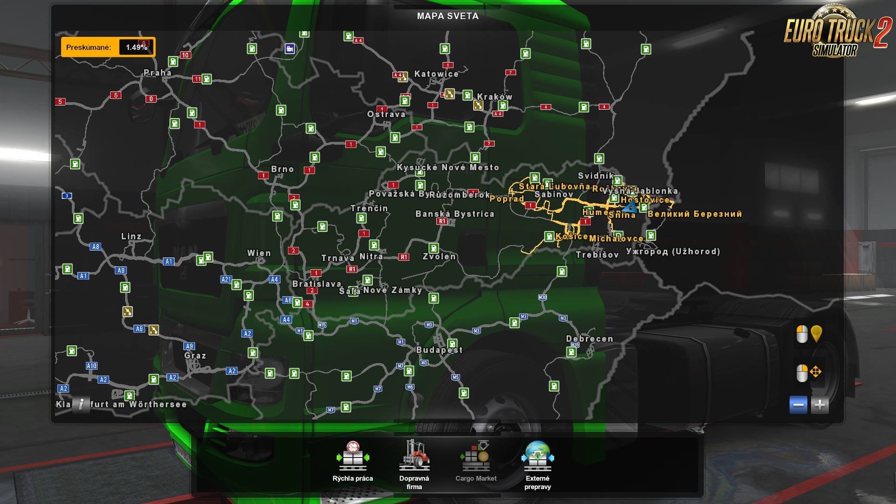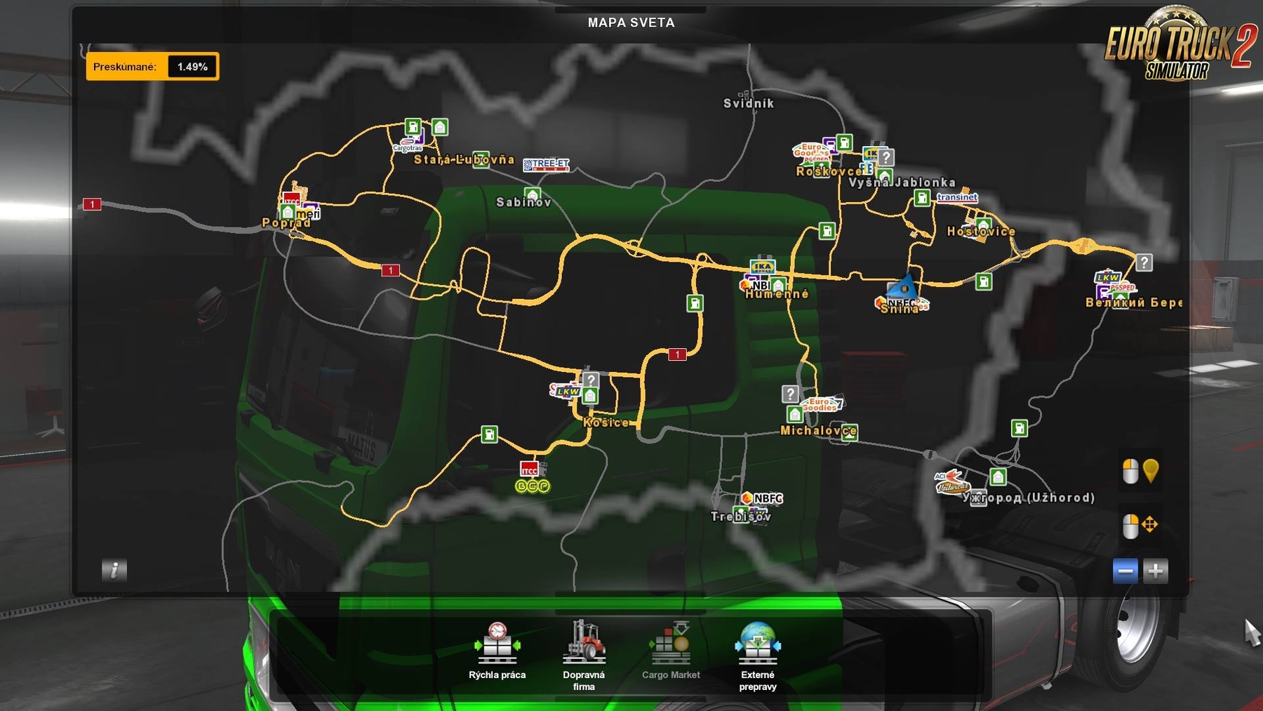 New changes v10: - Added 2 New Cities - New loading photos - Truck Dealer/Service FIXED - In Europe.rar is Europe.scs Included: – 12 New Slovakian Cities (Humenné, Snina, Vyšná Jablonka, Roškovce, Hostovice, Michalovce, Trebišov, Poprad, Nitra, Trenčín, Kysucké Nové Mesto, Považská Bystrica) – 2 New Ukraine Cities (Ужгород, Великий Березний) – 4 New Slovakian MiniCities (Svidník, Ružomberok, Zvolen, Trnava) – Real Slovakian Roads and Signs (with some road changes) – For version 1.32.3.7!!!! Install help: 1. Download 2. Copy europe.scs to folder mod in game. Enjoy and Play! (The map is called europe, because it’s maked to europe.mbd) Credits: KimiSlimi |