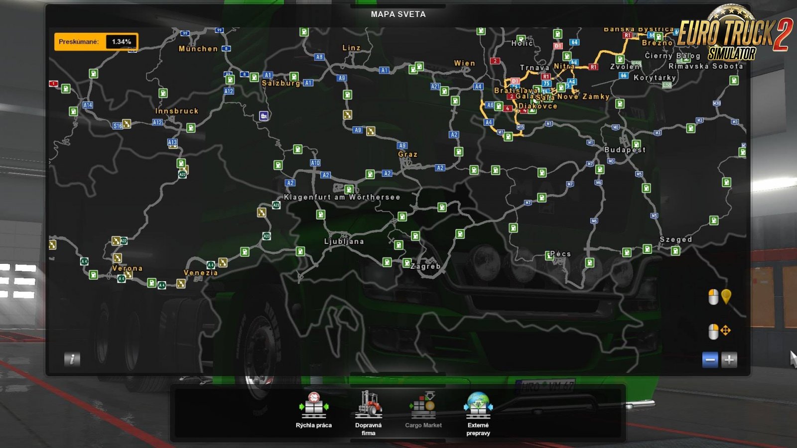 New changes in v13: - 2 new areas were added: Slovenia and Croatia - 3 new cities in Slovakia (Galanta, Diakovce, Fekišovce) - 2 new cities in Slovenia (Kranj, Dolnja Počehova) - a city in Croatia (Zagreb) - fixed bugs - connecting with Italy, Austria and Hungary from Slovenia and Croatia The map work in 1.33.x game version !!! Features: It’s New Slovakia Map with all of Europe countries. You will need expansions – DLC BALTIC SEA REQUIRED Included: 21 cities in Slovakia (Humenné, Snina, Vyšná Jablonka, Roškovce, Hostovice, Michalovce, Trebišov, Poprad, Nitra, Trenčín, Kysucké Nové Mesto, Považská Bystrica) - 2 cities in Ukraine (Uzhhorod, Veliky Berezniy) - 4 settlements in 4 townships in Uzhgorod, Berezniy) - 4 villages in Ukraine (Uzhhorod Bystrica ) - 4 settlements in Ukraine (Uzhgorod, Veliky Berezniy) - 4 settlements in Ukraine (Uzhgorod, Veliky Berezniy) - 4 settlements (Svidník, Ružomberok, Zvolen, Trnava) - Realistic Slovak roads and signs – For game version 1.33.x!!!! Install help: 1. Download 2. Copy europe.scs to folder mod in game. Enjoy and Play! (The map is called europe, because it’s maked to europe.mbd) Credits: KimiSlimi |
