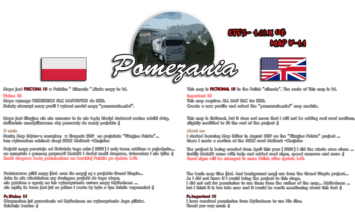 Change log v1.1 from 03.02.21: Fix weather for 1.40 Change log v1.1: About 16 km of roads have been added The village of "Piekło" has been added Bus stop icons have been added Added info boards with the list of "Donator's" and icons of their locations on the minimap ( letter "D" ) More streetlights outside of cities Bug-fix Credits: pawulonn1 |