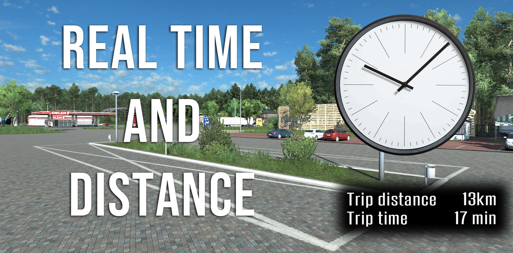 This mod change time and distance displayed in-game to real. Example: normally you drive 19km and game show you 19 min to arrive. Because ETS2 map is made in 1:19 scale, distance and time are x19 times faster than real. This mod shows you real distance and time to arrive. According to example: game will show you 1km and 1 min to arrive. Compatible with 1.37 and 1.38. Also should work on previous versions (not tested) No DLC required Work on SCS map only! There is also a version for Promods Autor: Adison Cavani Credits: Adison Cavani |