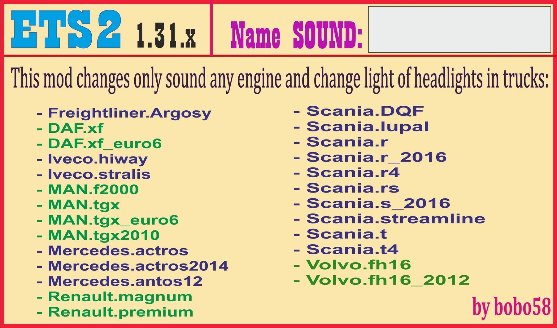 ATTENTION! 11 different engine sounds for trucks in ETS2 – -= Euro Truck Simulator 2 ver.1.31.x =- – These mod replace the sound of any engine and light of headlight in trucks: -= ( list 26 trucks ) =- – Freightliner.Argosy – daf.xf – daf.xf_euro6 – iveco.hiway – iveco.stralis – man.f2000 – man.tgx – man.tgx_euro6 – man.tgx2010 – mercedes.actros – mercedes.actros2014 – mercedes.antos12 – renault.magnum – renault.premium – scania.DQF – scania.lupal – scania.r – scania.r_2016 – scania.r4 – scania.rs – scania.s_2016 – scania.streamline – scania.t – scania.t4 – volvo.fh16 – volvo.fh16_2012 Mods list – Is name list of mods, differing only by a sound of the engine: 01 – Engine_Sound- Credits: bobo58 |