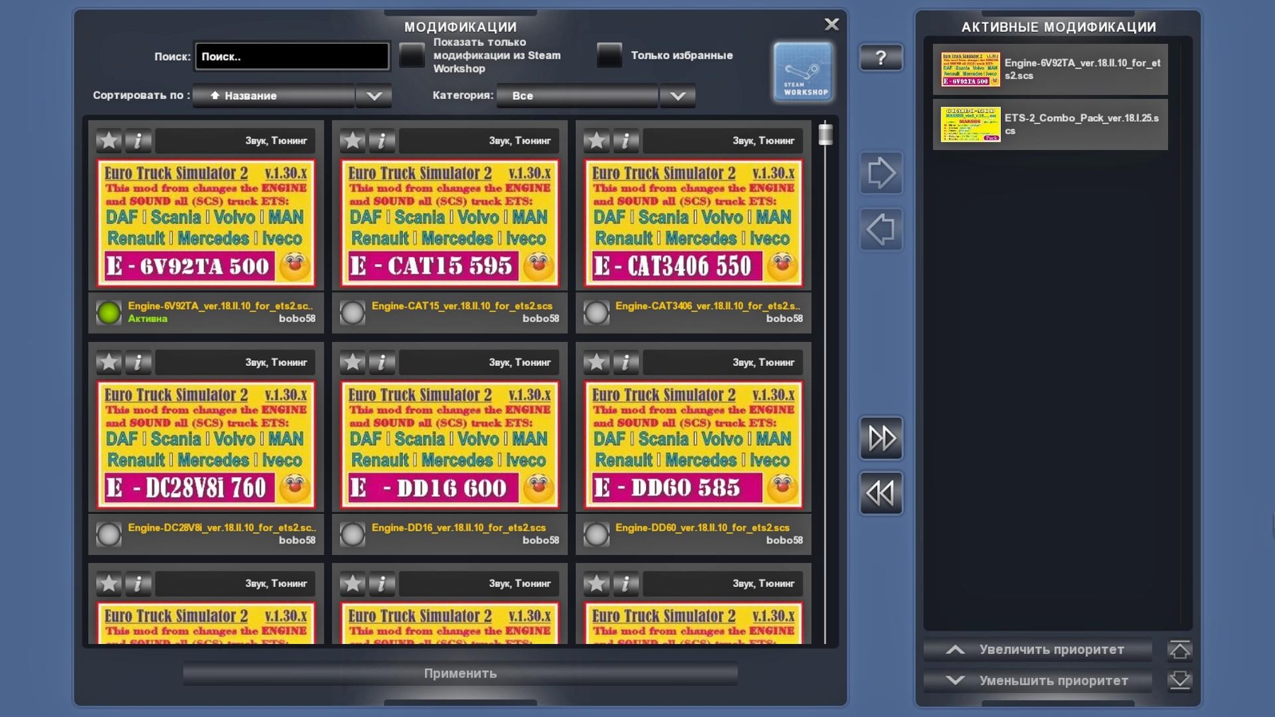 ATTENTION! You have the right not to use these mods and the delete them your out PC. You can freely distribute these mods on your behalf. – – – – – – – – – again assembled mods – 10.02.2018 _ _ _ = Euro Truck Simulator 2 ver.1.30.x =_ _ _ – These mods change in the game only the engines with their sound in all (SCS) trucks ETS-2. _ USER MANUAL: _ These mods do not change the game process, you can use them at any time, it’s enough to leave the game and connect or replace one mod then continue the game. _ For correct operation, use any one, but only one mod – – – – – – – – – – These mods change in the game only the engines with their sound in all (SCS) trucks ETS-2: – Daf XF 105 (SCS) – Daf XF Euro 6 (SCS) – Iveco Hiway (SCS) – Iveco Stralis (SCS) – Man TGX (SCS) – Mercedes Actros 2009 (SCS) – Mercedes Actros 2014 (SCS) – Scania R (SCS) – Scania Streamline (SCS) – Scania R 2016 (SCS) – Scania S 2016 (SCS) – Renault Magnum (SCS) – Renault Premium (SCS) – Volvo FH16 2009 (SCS) – Volvo FH16 2012 (SCS) The name list of mods, differing by a engines with their sound for trucks ETS-2. = = = = = = = = _ List mods: 01 – Engine-6V92TA_ver.18.II.10_for_ets2.scs 02 – Engine-CAT15_ver.18.II.10_for_ets2.scs 03 – Engine-CAT3406_ver.18.II.10_for_ets2.scs 04 – Engine-DC28V8i_ver.18.II.10_for_ets2.scs 05 – Engine-DD16_ver.18.II.10_for_ets2.scs 06 – Engine-DD60_ver.18.II.10_for_ets2.scs 07 – Engine-DDS92_ver.18.II.10_for_ets2.scs 08 – Engine-ISX15_ver.18.II.10_for_ets2.scs 09 – Engine-ISXS_ver.18.II.10_for_ets2.scs 10 – Engine-MX13_ver.18.II.10_for_ets2.scs 11 – Engine-N14_ver.18.II.10_for_ets2.scs 12 – Engine-N14C_ver.18.II.10_for_ets2.scs _ end the mods _ When creating this mods, were used parts of mods – Kriechbaum and other mods, authors I do not know. all in archive: ETS_12mod___bonus_v.18.II.10.rar (~ 45mb) Credits: bobo58 Credits: bobo58 |