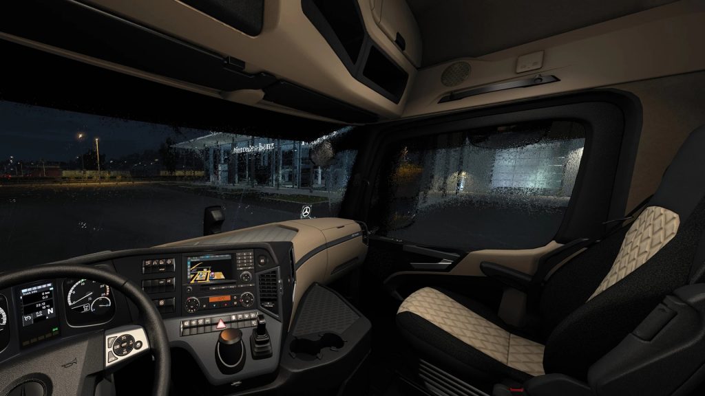 – Clean-up and/or re-modeling of many meshes – Re-arrangement or re-creation of almost all of the meshes uv-maps for better tiling – Many new materials and textures for dashboard, side and door panels (more reflections as we have it in reality, everything reflects) – New material/optics for Actros StyleLine with better brushed aluminium – New high-res ambient occlusion maps instead of vcolors – Reflection and specular layer for the windshield, satnav and aircon display – Dot-matrix for windshield and sensor housing – Lit decals now turns on with electric / changed to yellowish color – New switches for sidepanel (differential, hazard, …) – Animated and lit switches for differential, truck and trailer lift-axle – New satnav and aircon models including satnav interface overlay – New VDO and fleet management models (the panel for it is still WIP) – Accessory-slots for ceiling and dashboard lighting (activated either by electrics (E) or beacon (B)) – 3-pane setup for windshield rain instead of 1-pane for more density of raindrops (+ no more rain clipping through sunshield) – New whiper animations that better fits the curvaturs of the windshield – New Accessory: Wind-/rain-deflector for side windows – New Accessory: Painted front and side-mirrors – New headlight lightmask baked from physical lights- and reflection-setup in Blender – Experimental/STC: Headlights with less texture and more reflections (maybe obsolete with Dotec’s MP4) Credits: MatzeH Credits: MatzeH |