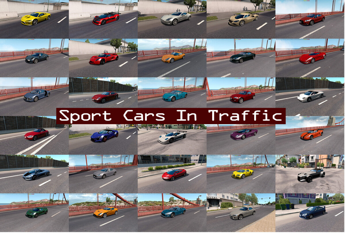 Pack adds in traffic 228 sport and super cars: AC 378 GT Zagato Acura NSX(’05, ’17), Integra, RSX Alfa Romeo 4C, 8C Competizione Apollo Intensa Emozione Arash AF10 Ariel Atom Ascari A10, KZ1 Aspark Owl Aston Martin One 77, DB9 Volante, Rapide, DB11, Vulcan, Vantage (’98, ’18), Virage, Vanquish ’01, DB7 Zagato, V12 Vantage Audi R8(’10, ’19), TT(’04, ’09, ’16) Bentley Continental (Supersport ’10, GT ’18), Bacalar Mulliner BMW i8, Z3(E36/8), Z4(E86, E89, G29), Z8, 8(G14), M3 GTR Bugatti Veyron, Chiron, EB110, Divo Chevrolet Corvette (’02, ’14, ’20), Camaro ’02 Chrysler Crossfire Devon GTX Dodge Stealth, Viper ’03 Donkervoort D8 GTO Equus Bass 770 Falcon F7 Felino CB7 Ferrari LaFerrari, 612 Scaglietti, GTC4Lusso, California, F40, F50, Enzo, 360 Modena, 458 Italia, F430, F355, FF, 599 GTO, 812 Superfast, 488 Pista, F12berlinetta, SF90 Stradale, Roma, 575M Maranello Fiat 124 Spider ’17 Fisker Karma Ford GT(’06, ’17) Ginetta F400 GTA Spano Gumpert Apollo N Hennessey Venom GT Honda S2000, CR-X Del Sol, CR-X ’91, Prelude HTT Plethore LC-750 Hyundai Tiburon, Genesis Coupe(’10, ’13) Icona Vulcano Italdesign Zerouno Jaguar XJ220, F-Type, XK(’02, ’10) Kepler Motion Koenigsegg One:1, CCXR, Regera, CC8S, Gemera Lamborghini Gallardo LP 560-4, Diablo, Veneno, Aventador, Centenario, Murcielago, Reventon, Countach Lexus LFA, SC430, LC500, SC300, RC F Lotus Exige S Roadster, Evora, Elise(’99, ’05, ’17), Exige ’06, Espirit ’02, Evija Lucra L148 Maserati Gransport, GranTurismo, MC12, Spyder Mazda RX-7, RX-8, MX-5(’94, ’07) Mazzanti Evantra Mercedes-Benz SLS AMG GT, SLK(R171, R172), SL(R230, R231), SLR McLaren Roadster, AMG GTR, CLK63 AMG, CLK GTR, 190 Evo II McLaren 570S, P1, 720S, F1, 12C, 675LT, Senna Mitsubishi Eclipse(’95, ’03, ’12), Starion, 3000GT Morgan Aero SuperSports Mosler MT900 Nio EP9 Nissan GT-R, 350Z, 370Z Noble M600, M12 Pagani Huayra, Zonda Panoz Esperante Pininfarina Battista Pontiac GTO, Solstice, Firebird ’02 Porsche 911(997, 992), 718 Boxster, Carrera GT, Cayman(981), 959, 944, 918, 968 Rezvani Beast Alpha Rimac Concept One, C Two Rossion Q1 Saleen S7 Saturn Sky Savage Rivale Roadyacht Sbarro Alcador Scion FR-S Scuderia Cameron Glickenhaus SCG003 Spada Vetture Sport Codatronca Spyker C8 Aileron, C12 Zagato SSC Ultimate Aero Subaru Impreza WRX STI(GM, GD, GH, GV), BRZ GT Toyota Celica(’92, ’94, ’03), Supra(’92, ’98, ’19), MR2(’89, ’95, Spyder) TVR Sagaris, Tuscan, Typhon Ultima GTR Vencer Sarthe W Motors Fenyr Supersport, Lykan Hypersport Wiesmann MF3 Zenvo ST1 All standalone. Works on any maps. Compatible with AI packs by Jazzycat. For version 1.43.x Included two versions: for use only with default traffic and for use with Jazzycats AI pack. You must have in mod folder two files: sport_cars_traffic_pack_by_TrafficManiac_v9.5_ats_base.scs and sport_cars_traffic_pack_by_TrafficManiac_v9.5_ats_def.scs (only with default traffic) or sport_cars_traffic_pack_by_TrafficManiac_v9.5_ats_jaz.scs (with Jazzycats AI pack) If you want to have many sport cars everywhere use only one file: sport_cars_traffic_pack_by_TrafficManiac_v9.5_ats_base.scs Version 9.5 – added new car Bentley Bacalar Mulliner, some optimizations and improvements Credits: TrafficManiac Credits: TrafficManiac |