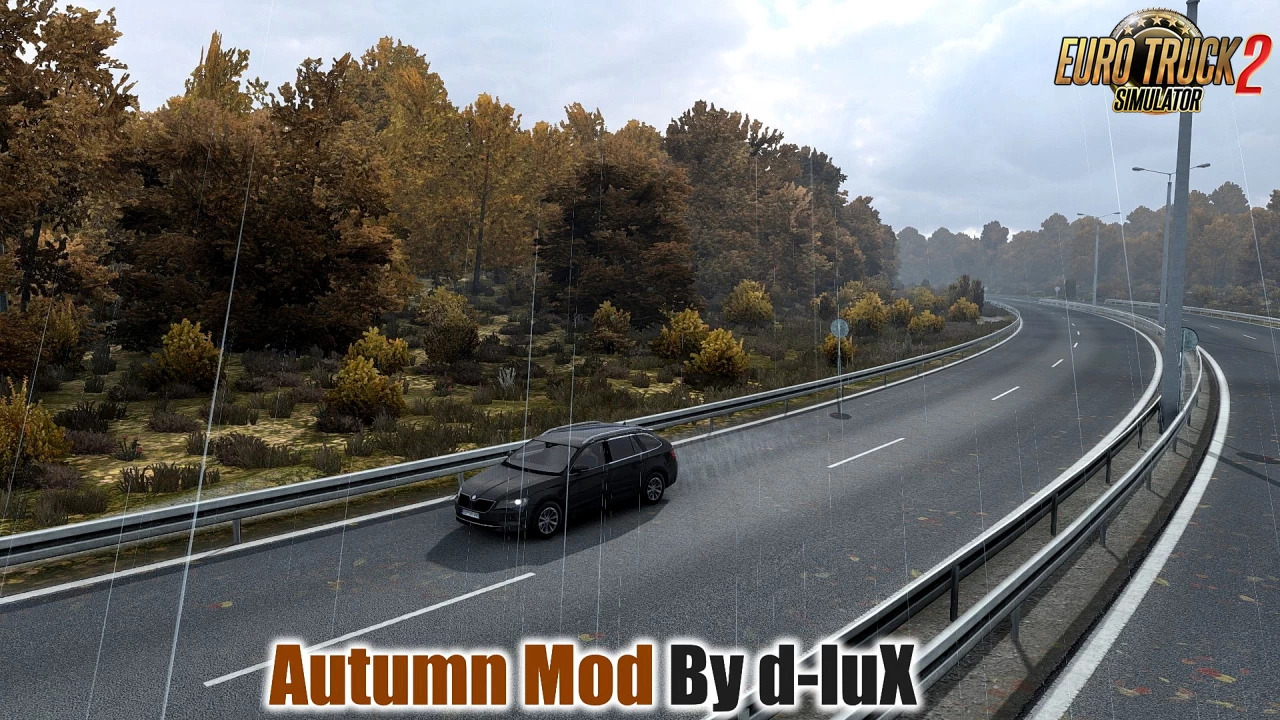 Autum Mod - this mod replaces several foliage textures with an autumn look. The hours between sunrise and sunset have also been adjusted to autumn. Changes in v1.1: - trees and bushes now have more autumn color variations. - some asphalt textures now have fallen leaves on the surface. - fixed missing alpha channel on some German roads. Recommended parameters - HDR Mode: On (Important!) - Vegetation Detail: High or Ultra - Grass Density: High or Ultra Credits: d-luX |