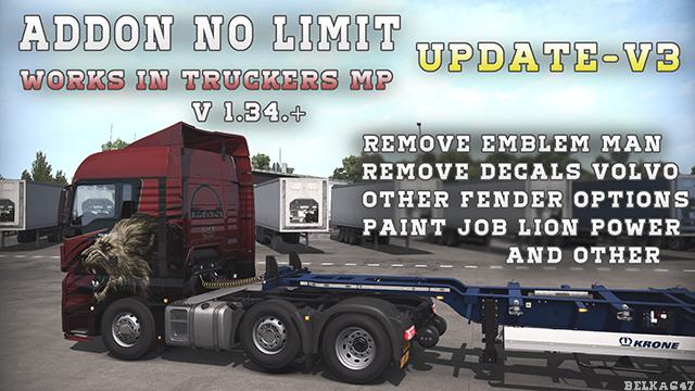 The modification removes some of the standard restrictions on the installation / removal of parts on the truck. Changes v3.0: 1. The ability of install paint job “Lion Power” Man E6 on all cabins. 2. The ability to remove the top decals on the Volvo FH16 2012. 3. The ability to remove the front logo “MAN”. 4. The ability to install other variants of the fenders on the MAN E6 and Scania NG. Feature List 1. The ability to remove the side mirror. 2. The ability to remove the sideskirt on the Iveco Hiway. 3. The ability to remove the steering wheel to the service station. 4. The ability to install paints for 8×4 cabs on the remaining cabs. 5. The ability to install cabin for chassis 8×4 on the other chassis. 6. The ability to install “Hubs” (Hub) with caps. 7. The ability to install exhaust without sideskirt. 8. The ability of install paint job “Lion Power” Man E6 on all cabins. 9. The ability to remove the top decals on the Volvo FH16 2012. 10. The ability to remove the front logo “MAN”. 11. The ability to install other variants of the fenders on the MAN E6 and Scania NG. Sequence of use (Perform everything in a single game) 1. Download the mod to the mods folder; 2. Go into the game and connect the mod in the profile (Manager of modifications); 3. Go to the service station; 4. Perform the actions you need; 5. You pay; 5.1.Go to Truckers MP. Credits: Belka647 Credits: Belka647 |