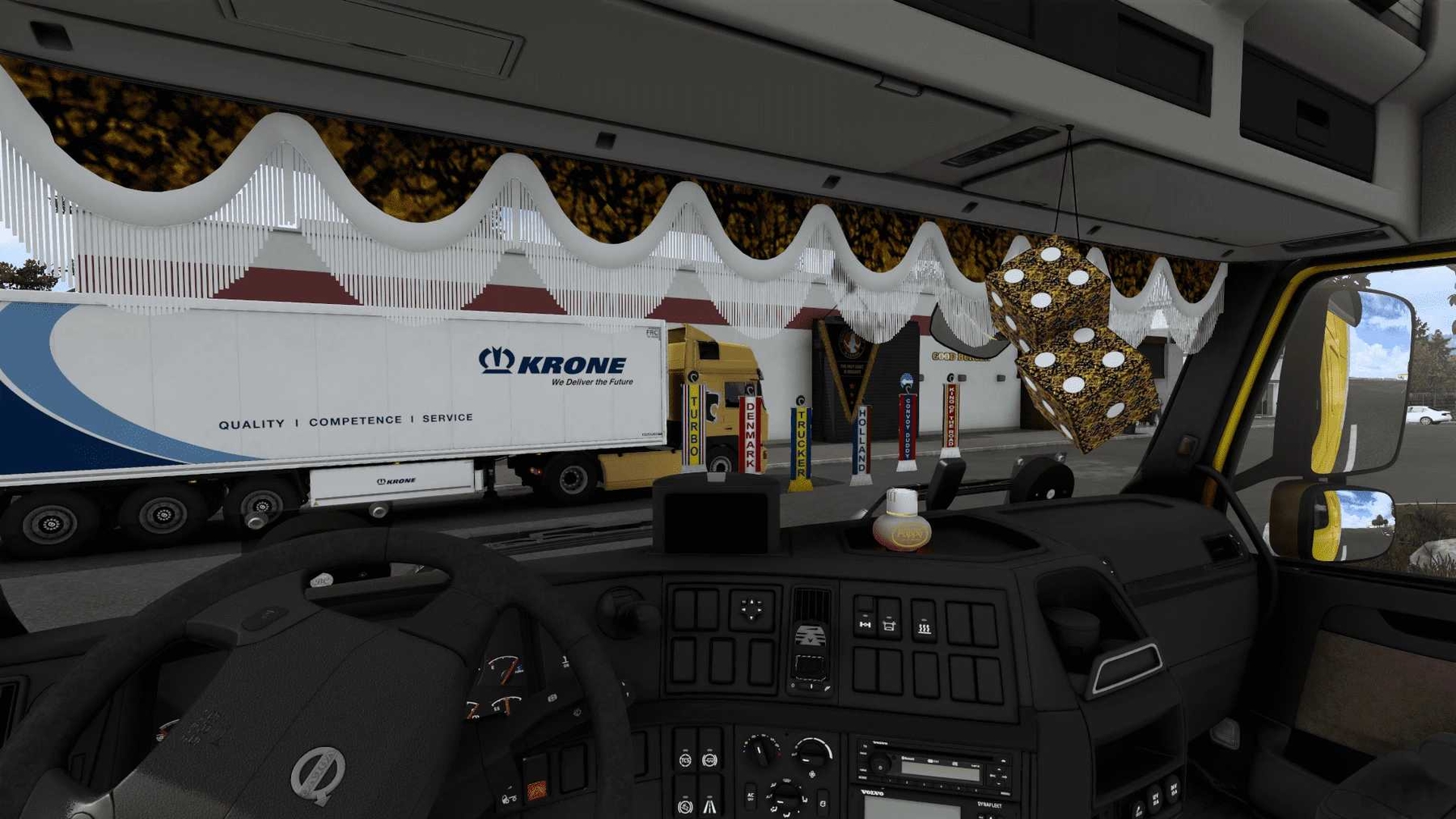 Modification allows you to purchase various accessories for the interior of your truck. Peculiarities: Standalone Poppy flavors on the panel Lightboxes for glass Penalty triangles Vimpel “Mini scarf” Hanging cubes Models have collision and shadow Support more than 60 trucks Works in the official convoy Fixed support: Volvo FM/FMX by Galimim Mercedes Benz Antos by Danz Renault DSI by Cyrusthevirus DAF 2021 by Jasper Added support: Scania t4/g/t/by rjl Scania G/P4 By Redex01 Volvo FH16 by Eugene Volvo FH5 by Virtual Service Renault DSI Tandem by Etophia Renault Magnum by Knox_xss Renault Evo by Gloover Man 19.361 by Truck Access Simulator Scania 113h by Rafael Alves Renault R by Truck Access Simulator Credits: Belka647 |